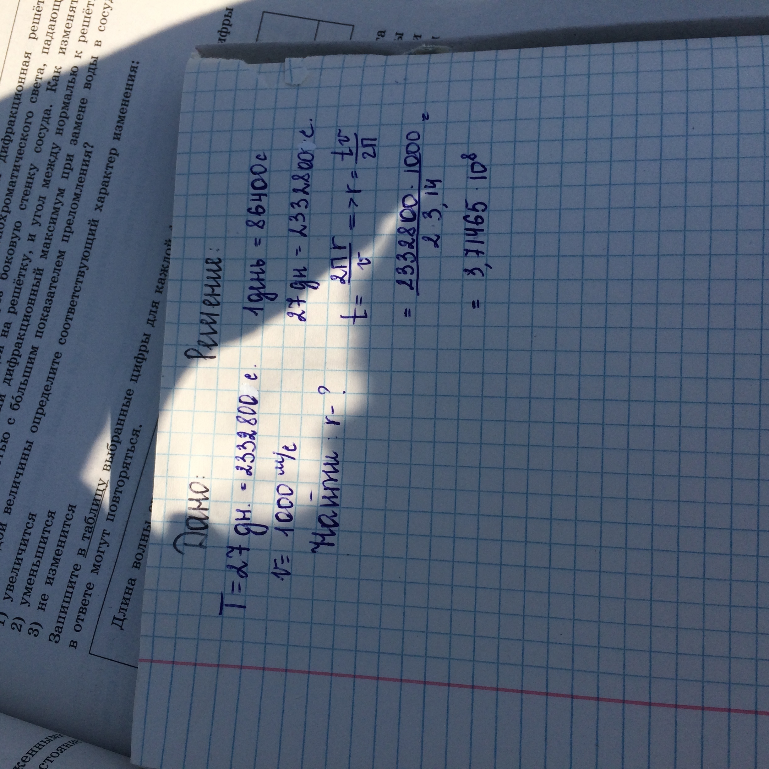 Период вращения Луны вокруг Земли равен T=27 дней. Определите радиус орбиты, по которой движется Луны