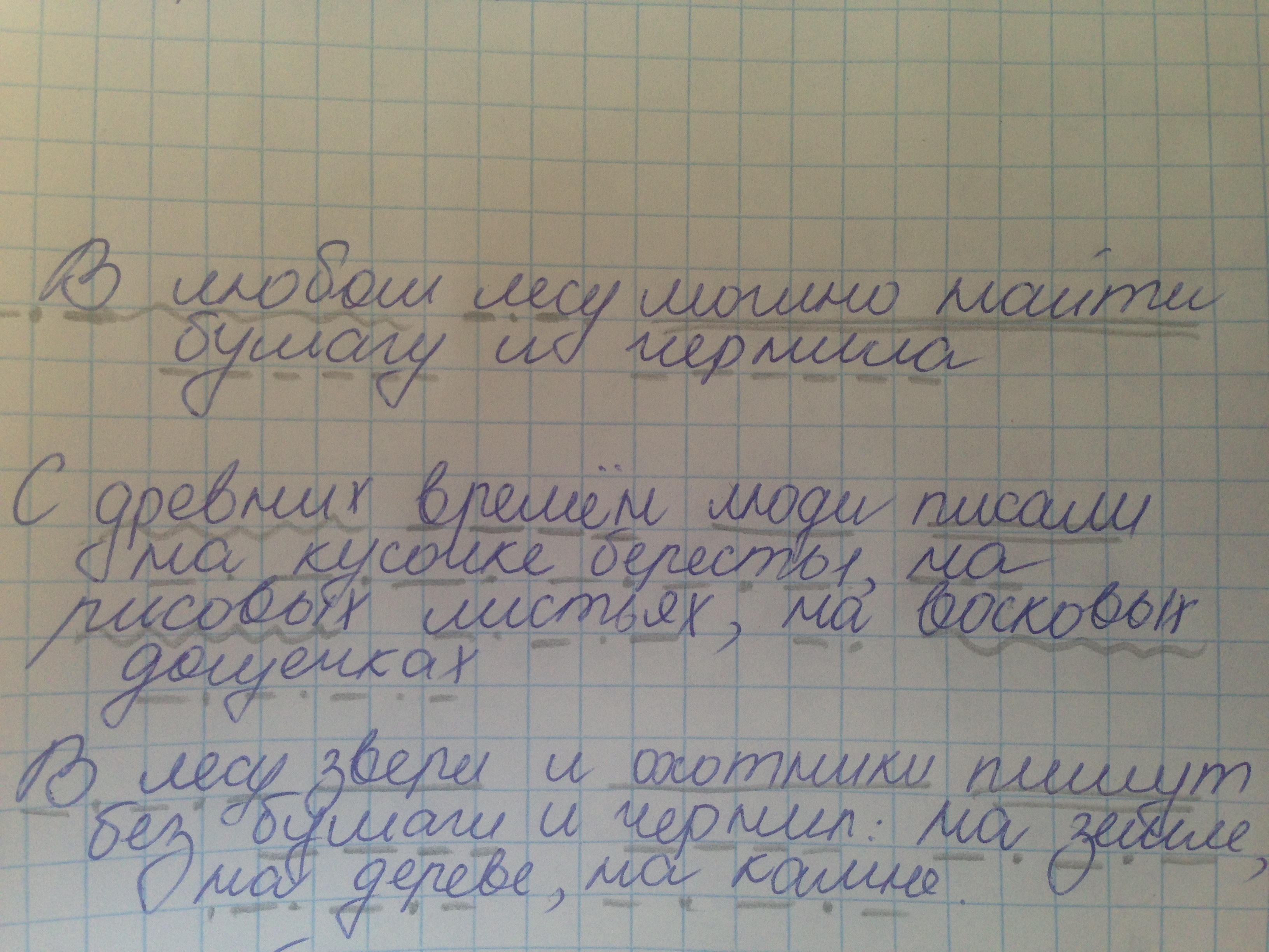 Выделить главные и второстепенные челены предложения. В любом лесу можно найти бумагу и чернила.С древних времен люди писали на кусочек бересты ,на рельсовых листьях,на восковых дощечках.В лесу звери и охотники пишут баз бумаги и чернил:на земле,на дереве,на камне.Чтобы читать такие письма ,нужен навык.