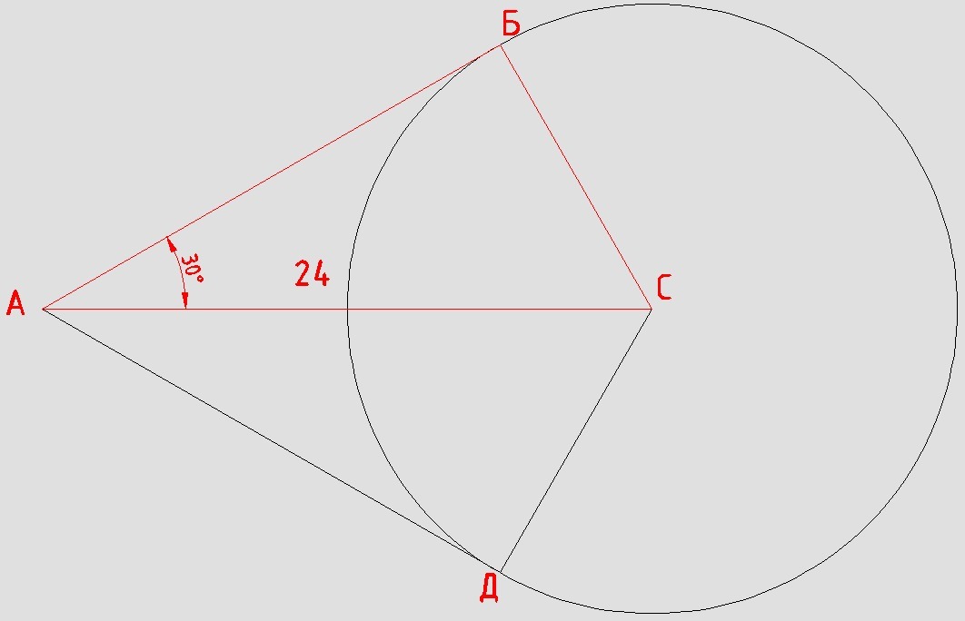 В красном прямоугольном треугольнике гипотенуза 24 см, угол БАС = 30°