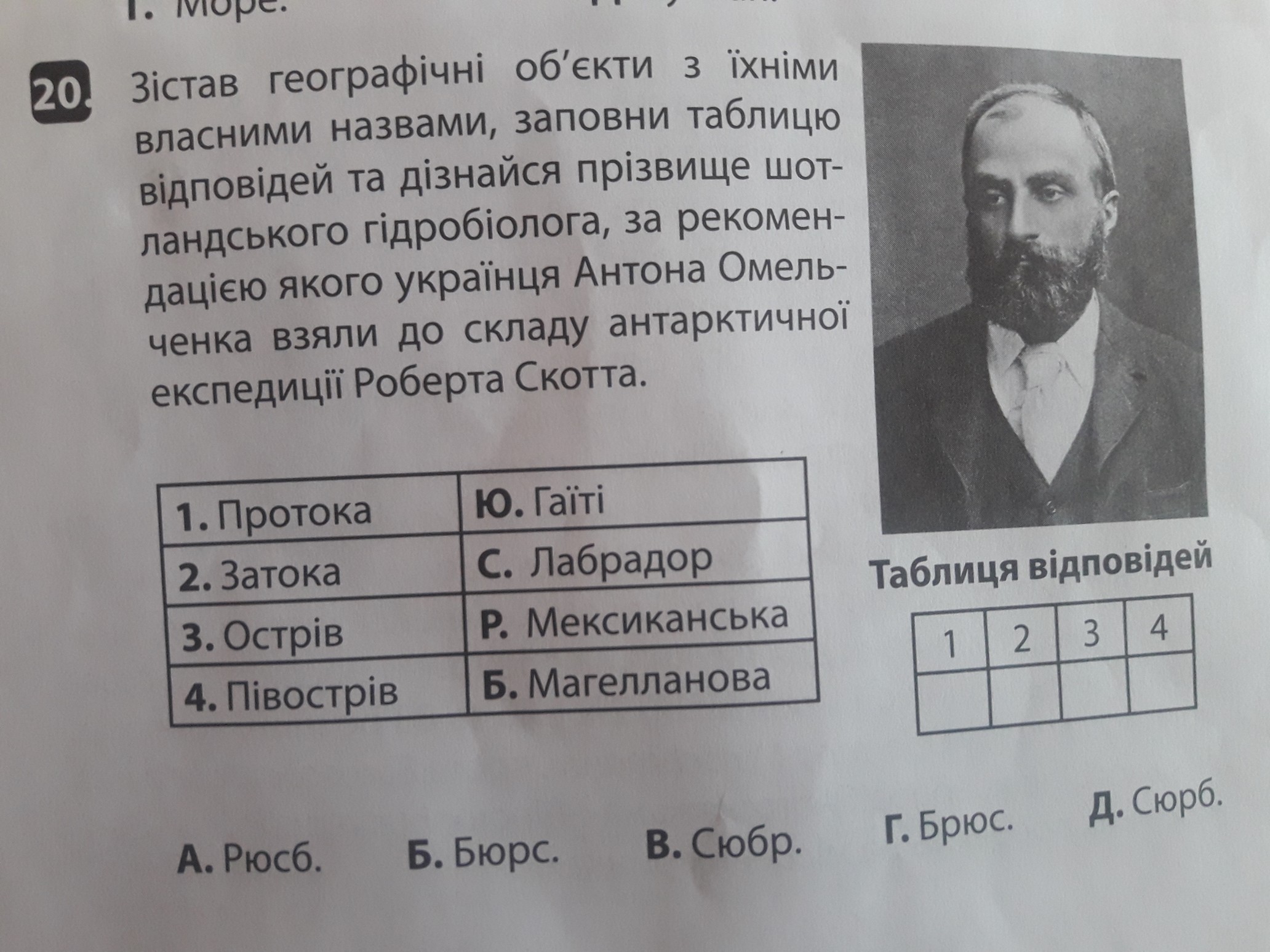 Зістав географічні об'єкти з їхніми власними назвами, заповни таблицю відповідей та дізнайся прізвище шотландського гідробіолога, далі текст на фото