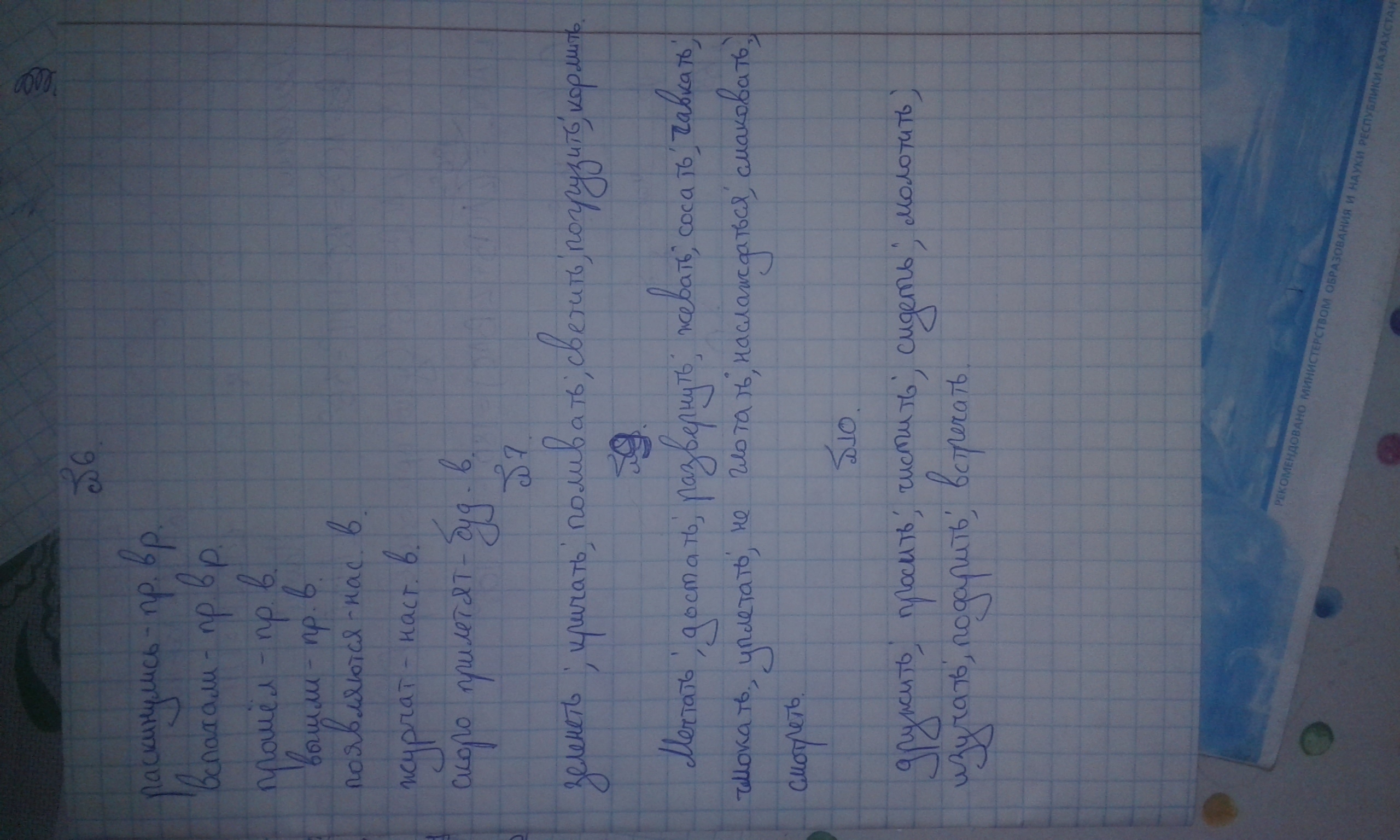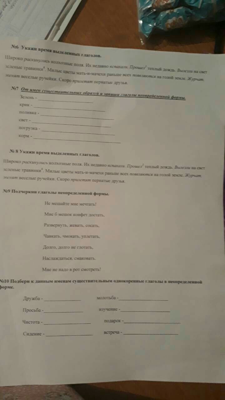 6 задание. Раскинулись- прошедшее время, вспахали- прошедшее, прошёл- прошедшее, вилезли- прошедшее, повеляются- теперешнее, журчат- теперешнее, прилетят- будущее. 7 задание. Зелень- зеленеть, крик- кричать, поливка- поливать, свет- светить, погрузка- погрузить, корм- накормить. 8 задание. тоже самое что и 6 задание. 9 задание. не мешайте, достать, жевать, уплетать, не глотать, наслаждаться, смотреть! 10 задание. Дружба-дружить, просьба- просить, чистота- чистить, сидение-сидеть, молотьба- молотить, изучение-изучать, подарок-подарить, встреча- встречать.