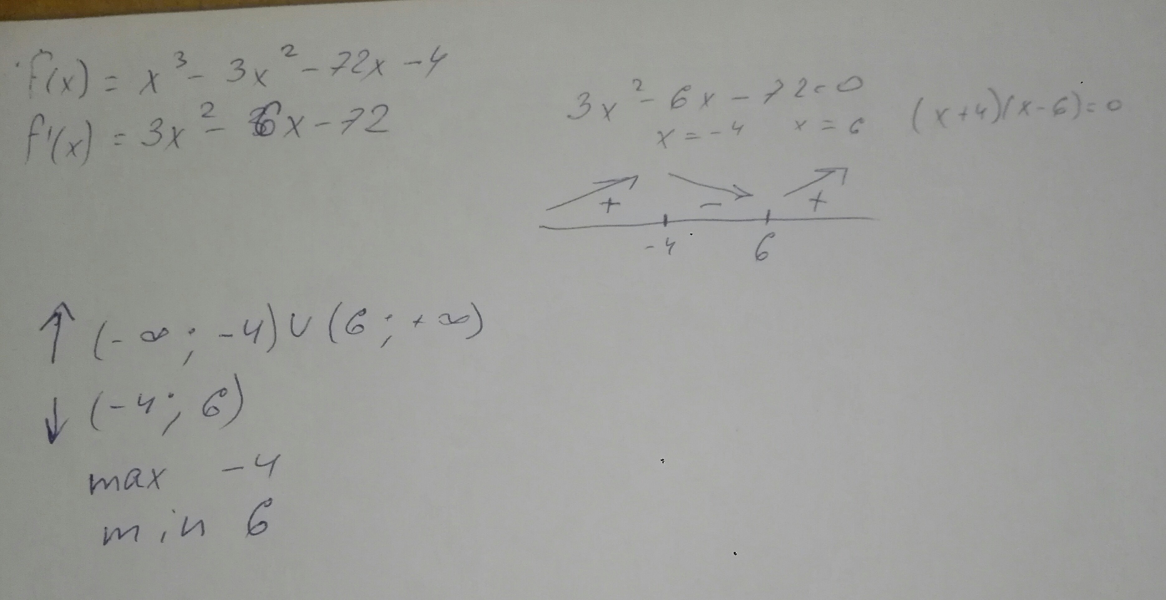 Найти промежутки возростания и спадания, и точки екстремума функции: f(x) = x^3 - 3x^2 - 72X - 4