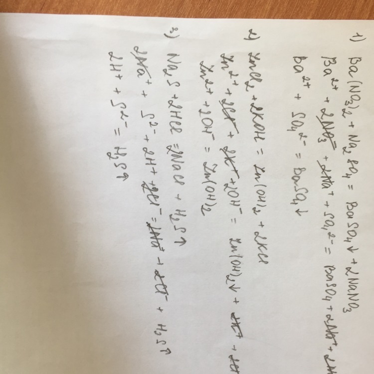 Запишите уравнения следующих реакций в молекулярном , ионном и сокращённом ионном виде : Ba(NO3)+Na2SO4 . ZnCl2+KOH . Na2S+HCL