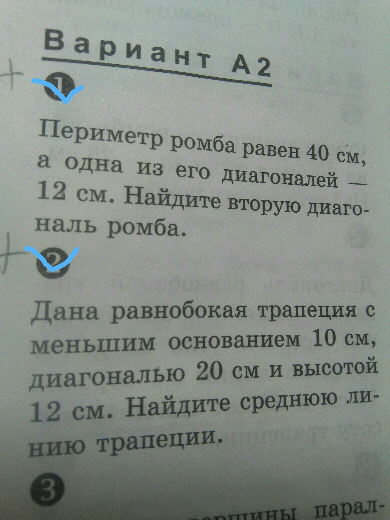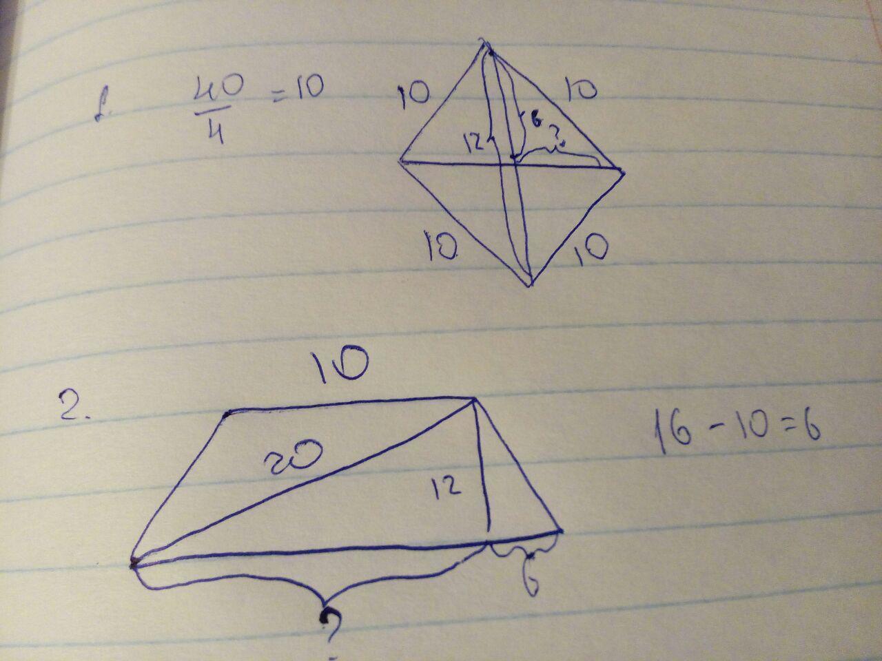 1. Т.к стороны в ромбе равны, значит 40/4=10 (каждая сторона). По теореме Пифагора найдём половину второй диагонали.