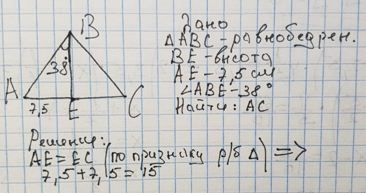 В р/б треугольнике АВС с основанием АС, отрезок ВЕ-высота. Найдите АС, если АЕ= 7,5 см и угол АВЕ = 38°