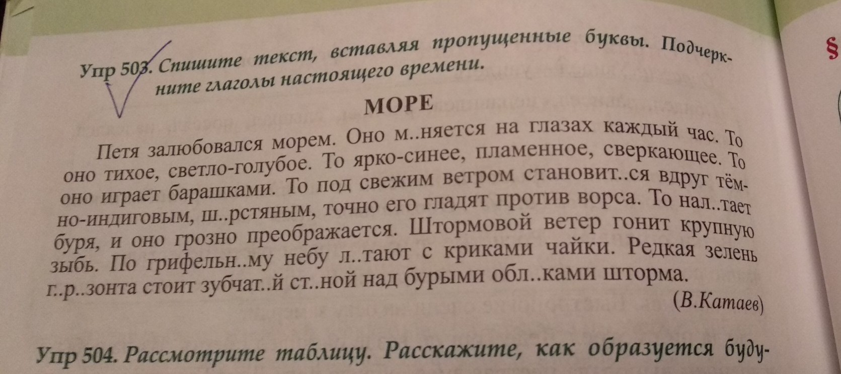 Петя залюбовался морем.Оно меняется на глазах каждый час. То оно тихое,светло-голубое.То ярко-синее,пламенное,сверкающие.То оно играет барашками. То под свежим ветром становится вдруг тёмно-индиговым,шерстяным, точно его гладят против ворса. То налетает буря,и оно грозно преображается. Штормовой ветер гонит крупную зыбь.По грифельному небу летают с криками чайки.Редкая зелень горизонта стоит зубчатой стеной над бурыми облаками шторма.
