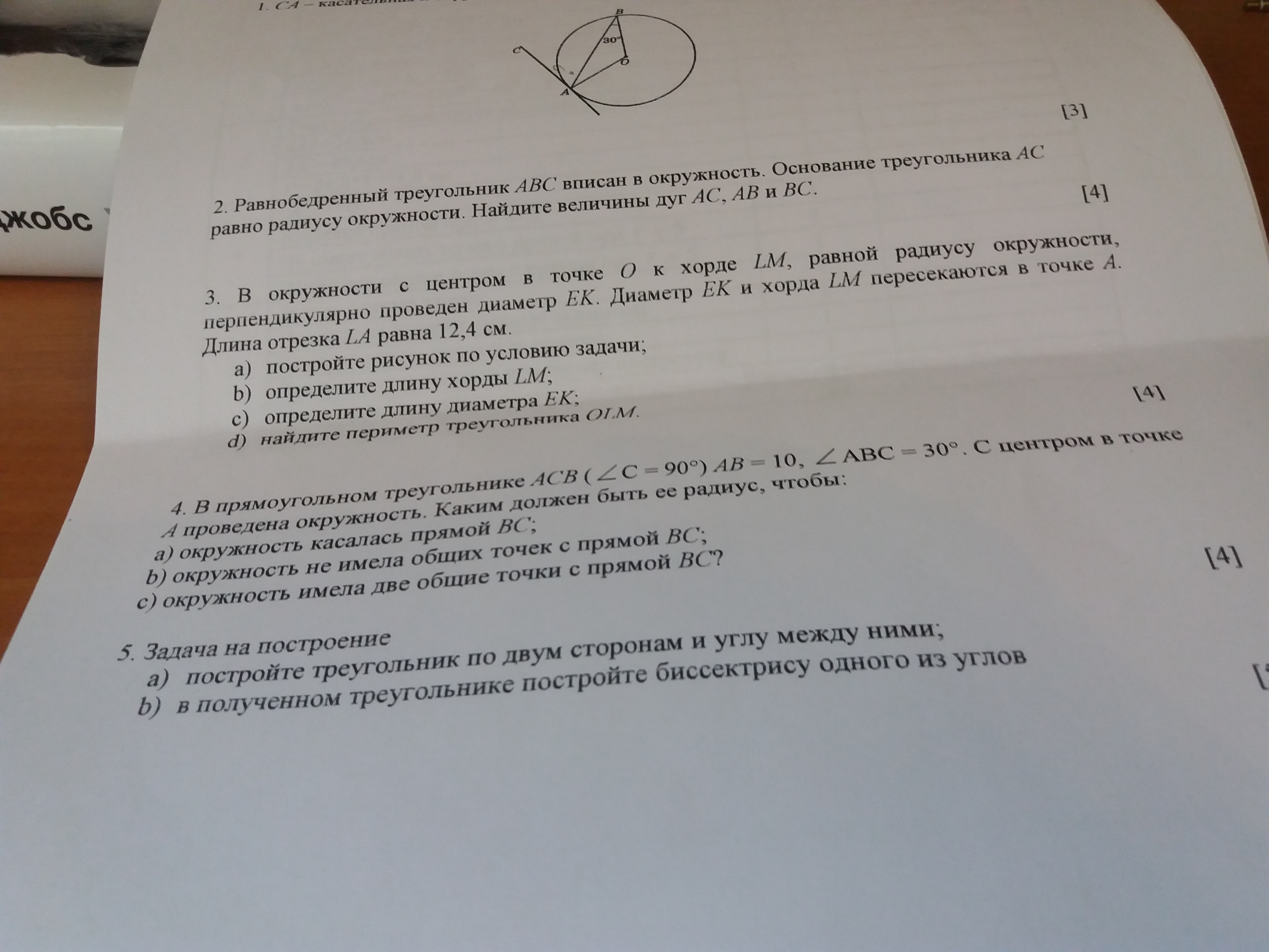 если хорда равна радиусу,то центральный угол 60 градусов. соедини центр с концами основания,получишь равносторонний. угол при вершине 30. а углы при основании 150/2=75 градусов.
