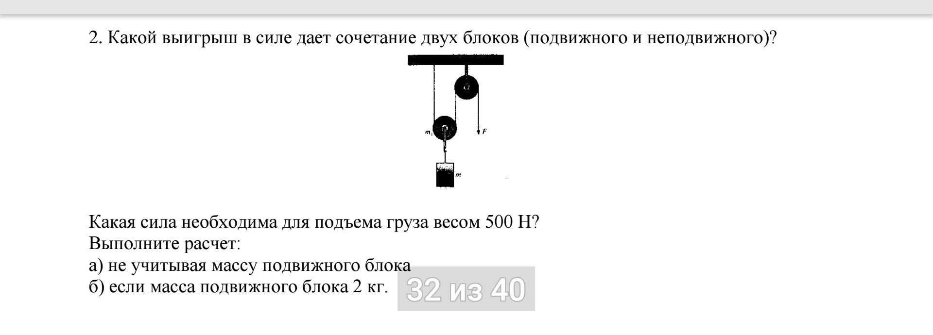 б) m=2 кг, mg=20 H, общая сила тяжести 520 Н. Чтобы поднять блок с грузом, нужно приложить силу 260 Н.