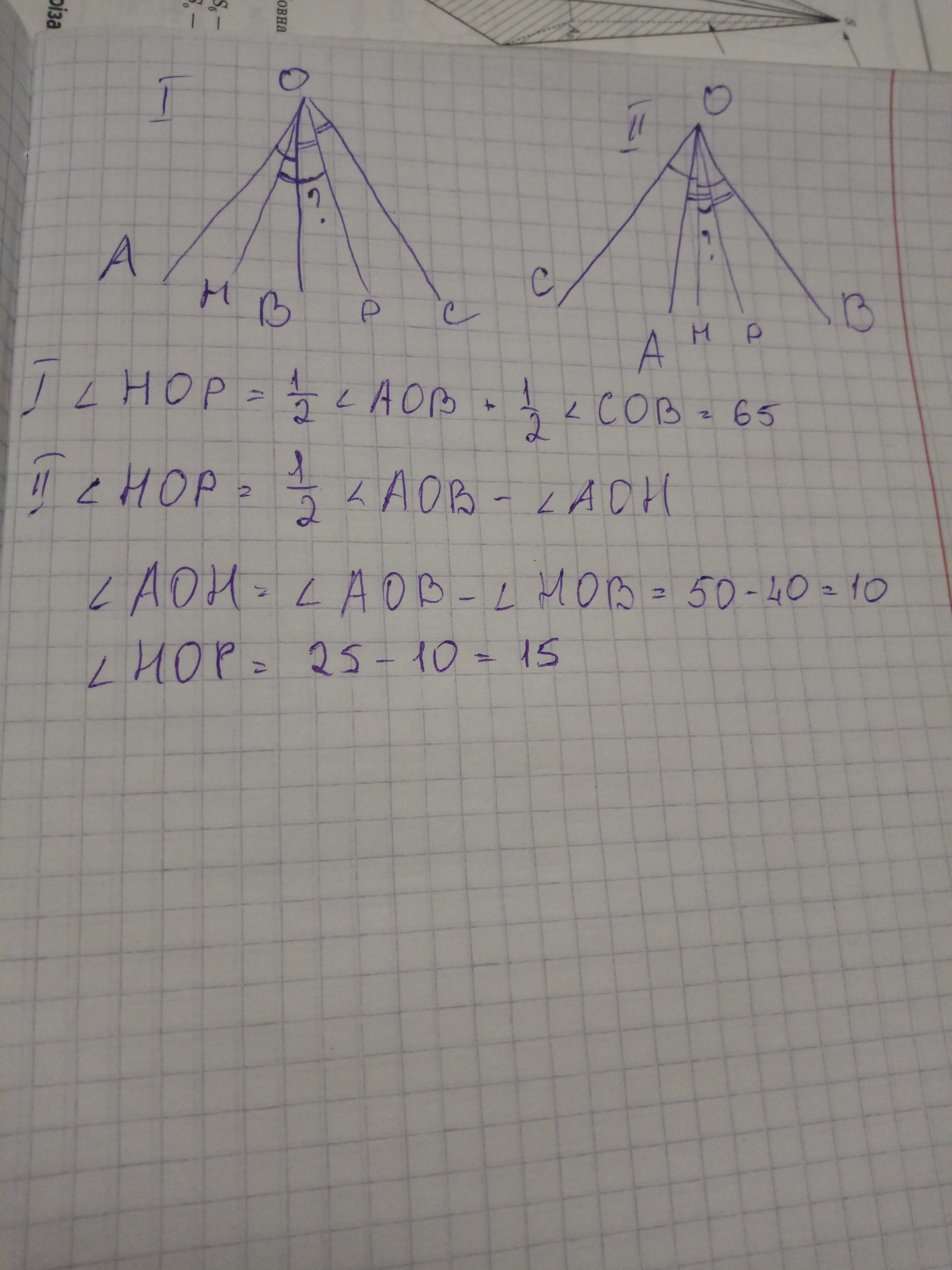 Помоги пожалуйста с геометрией .Найдите угол между биссектрисами углов AOB и BOC если AOB=50 градусов COB=80 градусов. Сколько решений имеет задача?