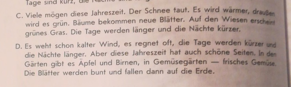 D. Дует холодный ветер, часто идет дождь, дни стают коротше, а ночи дольше. Но эта пора года имеет также красивые страницы. В садах есть яблоки и груши, в грядках - свежие овощи. Листья стают разноцветными и падают потом на землю.