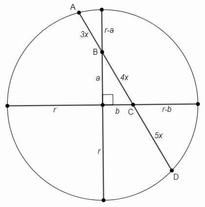 Помогите пожалуйста. Хорда AD окружности пересекает два взаимо перпендикулярных радиуса этой окружности в точках B и C, причём точка B лежит между точками A и C. Известно, что AB:BC:CD=3:4:5, а радиус окружности равен 3√13. Найдите длину хорды AD.