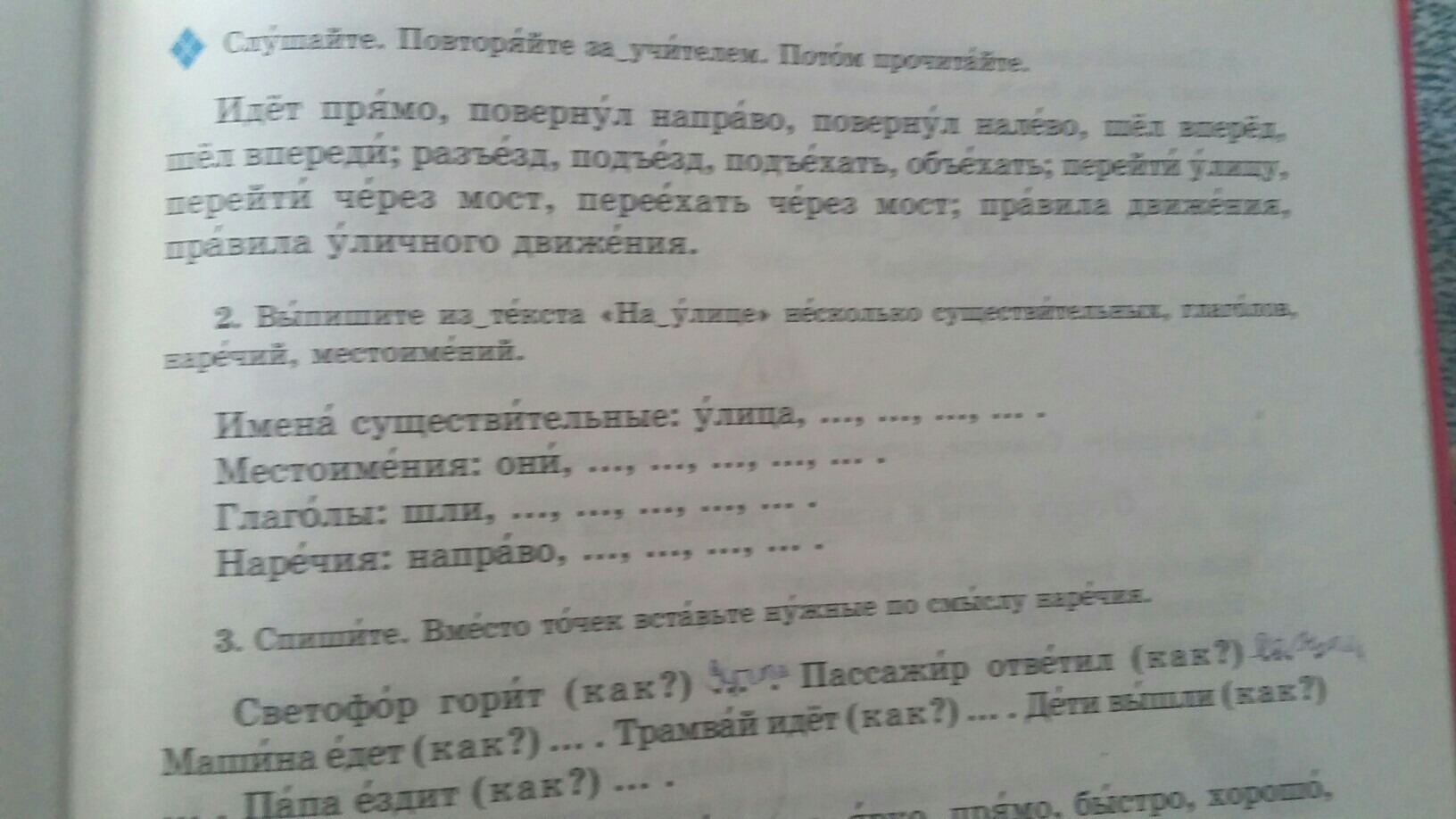 глагол: пишет, читает, слушает, ест.
