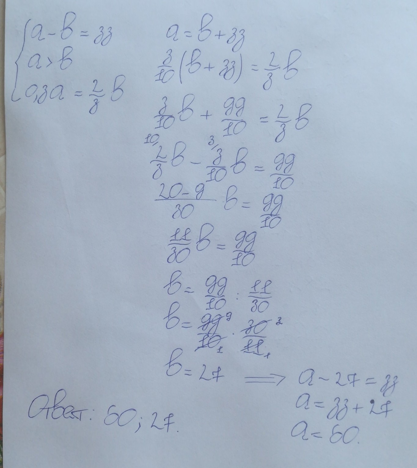 Разность двух чисел 33. Найдите эти числа, если 0,3 большего из них равны 2/3(двум третьим) меньшего