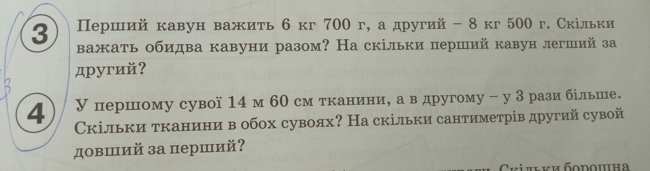 3) 6кг700г+8кг500г=15кг200г вага двох кавунів