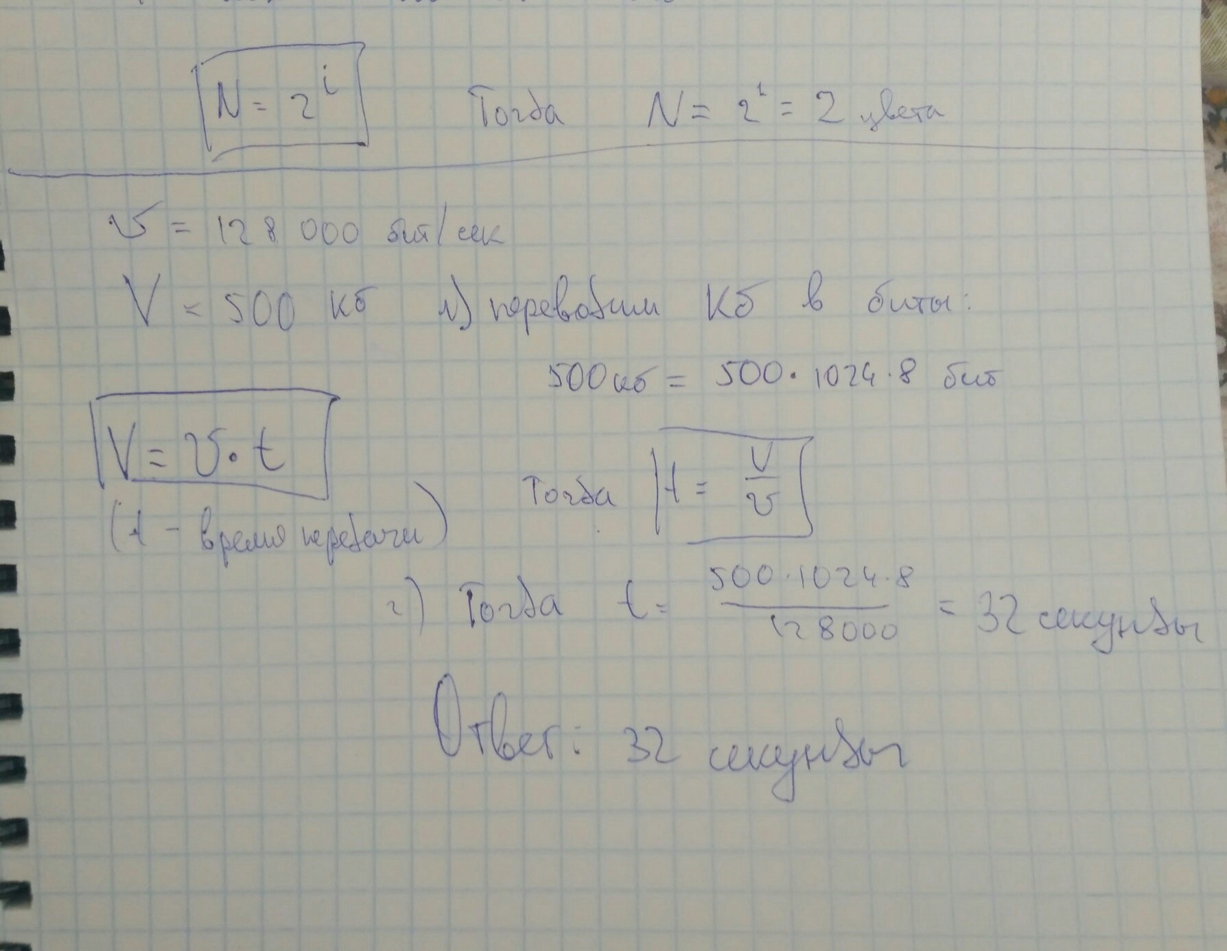 пропускная способность некоторого канала связи равна 128000 бит/сек. сколько времени займет передача файла объёмом 500 Кбайт по этому каналу?