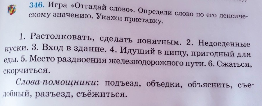 растолковать,сделать понятным объяснить.2 недоеденные куски объедки.3 вход в здание подъезд.4 идущий в пищу пригодный для еды съедобный. 5 сжаться,скорчиться съёжиться.