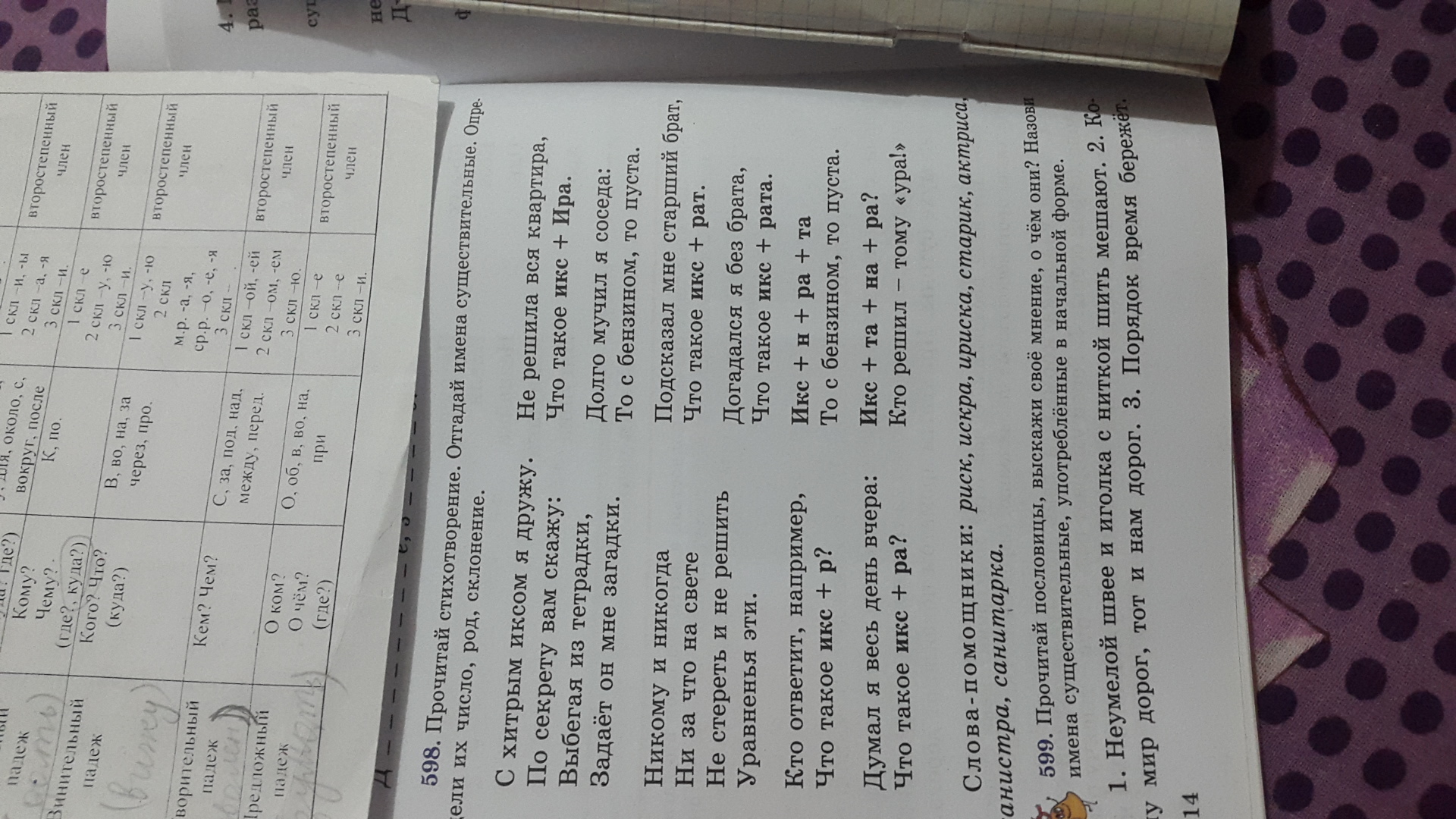 риск ед, ч, м.р. ск- 2 ; искра- ед.ч, ж.р. 1 скл. ириска -ед.ч. ж.р. 1 скл. ; старик-ед. ч. ,м.р., 2 скл. ;актриса-ед.ч, ж.р., 1 скл. ;канистра-ед.ч. ж.р. 1 скл,санитарка-ед. ч, ж.р. 1 скл
