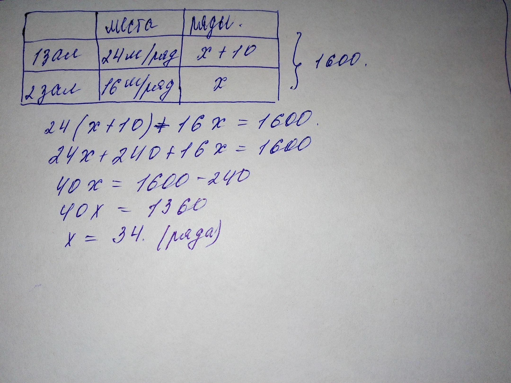 В театре имеется два зала: большой и малый. В большом в каждом ряду по 24 места, а в малом по 16 мест. Сколько рядов в каждом зале, если в большом их на 10 больше, а оба зала вмещают 1600 человек?