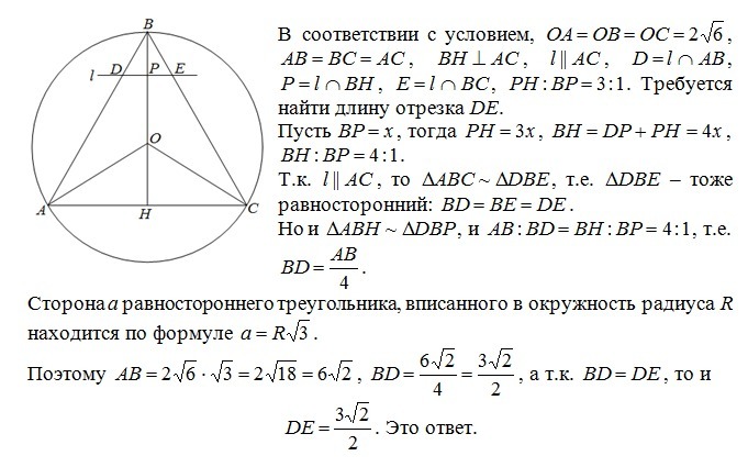 В окружность радиуса 2√6 вписан равносторонний треугольник. Прямая, параллельная стороне треугольника, делит высоту, проведенную к этой стороне, в отношении 3:1, считая от основания. Длина отрезка этой прямой, заключенной между сторонами треугольника, равна ?