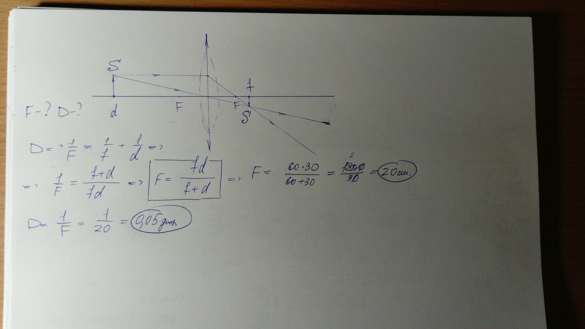 помещенного перед собирающей линзой на расстоянии 30 см, находится от неё на расстоянии 60 см. Найдите фокусное расстояние и оптическую силу линзы
