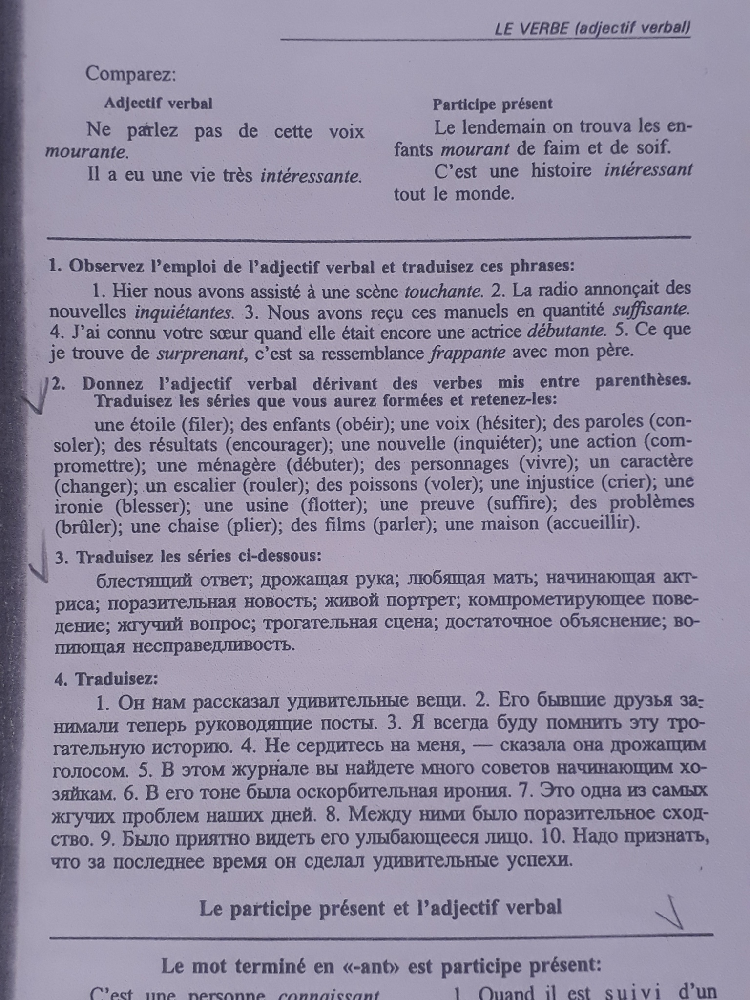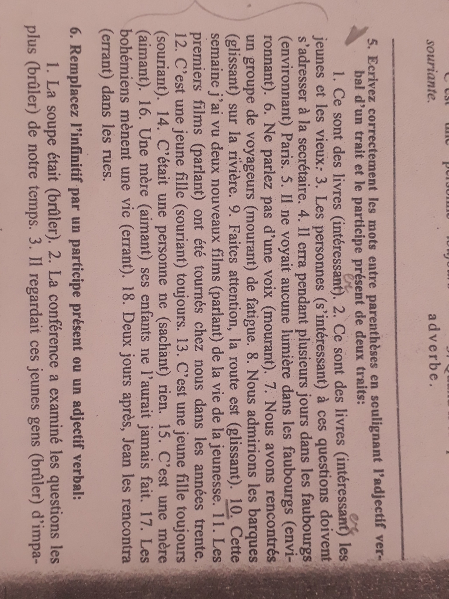 2) une étoile filante, des enfants obéissants, une voix hésitante, des paroles consolantes, des résultats encourageants, une nouvelle inquiétante, une action compromettante, une ménagère débutante, des personnages vivants, un caractère changeant, un escalier roulant, des poissons volants, une injustice criante, une ironie blessante, une usine flottante, une preuve suffisante, des problèmes brûlants, une chaise pliante,des films parlants, une maison accueillante.