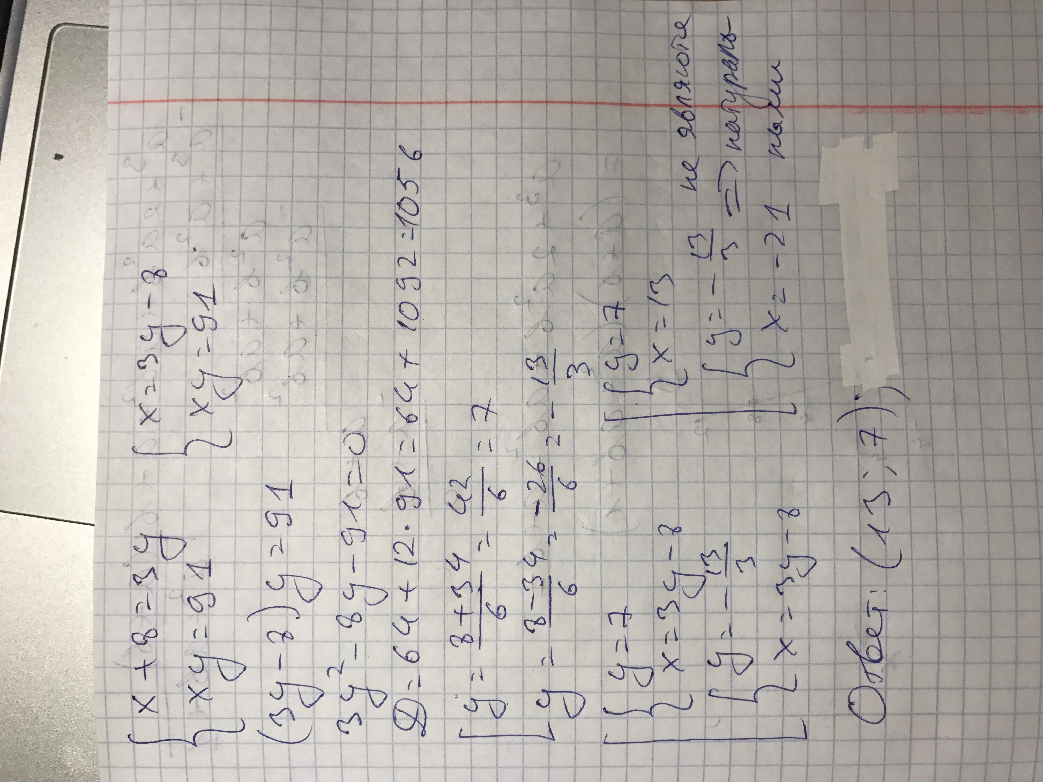 Задание: найдите два натуральных числа , если известно, что первое на 8 меньше от утроенного второго, а их произведение равняется 91