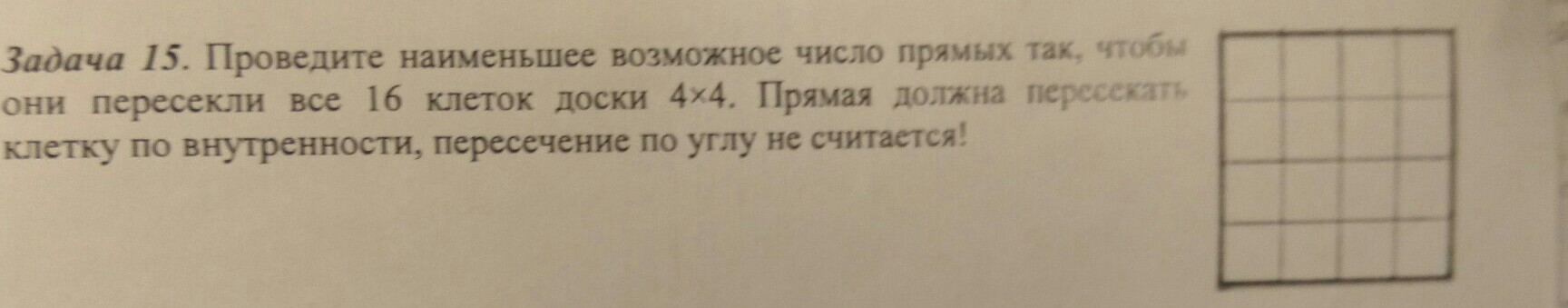 Наименьшее число: 4, так как если провести четыре прямых по горизонтали или вертикали, все прямые пересекают клетки