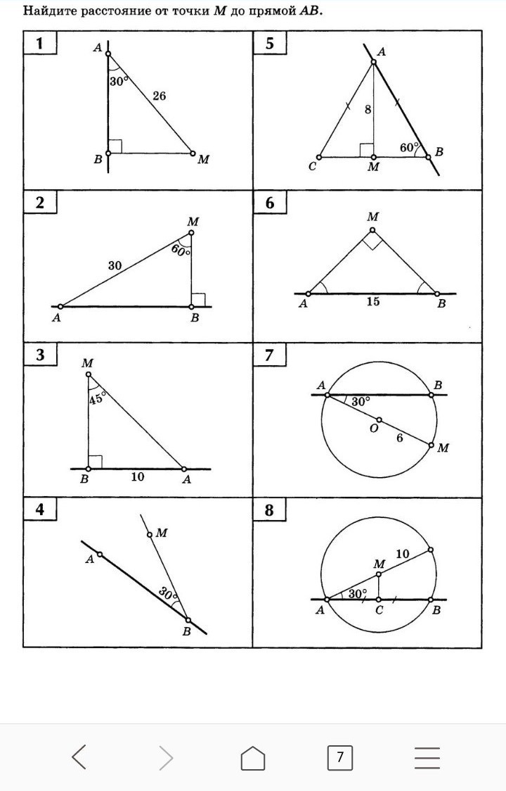 7)проводим ВМ - искомое расстояние. имеем треугольник АВМ, в котором катет напротив угла в 30° равен половине гипотенузы, то есть ВМ=0,5*6=3
