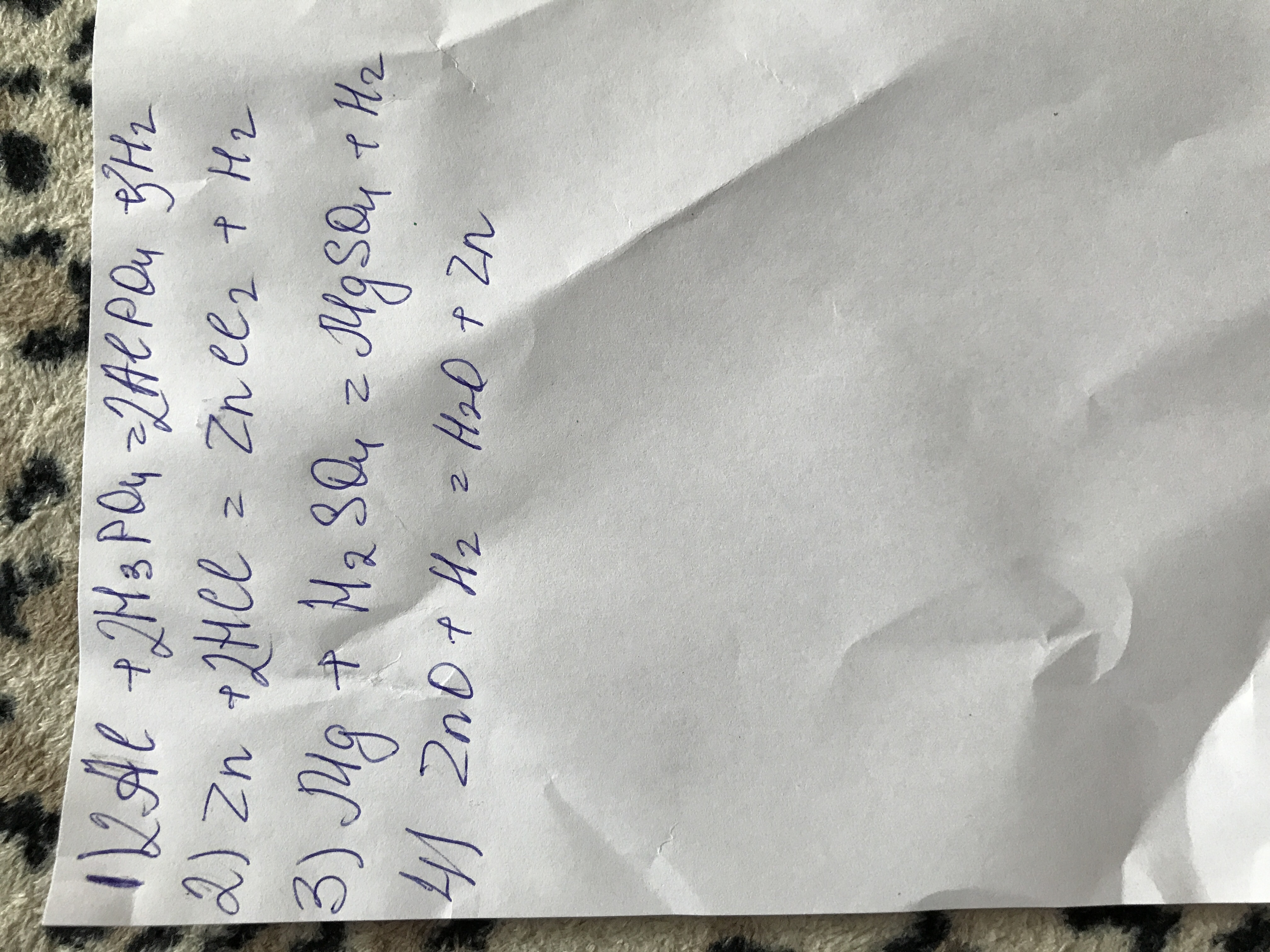 составте уравнение реакций: 1)алюминий+фосф.кислоты 2) цинк+хлоровод кисл. 3)магний+серная кислота 4) оксид цинка +водород