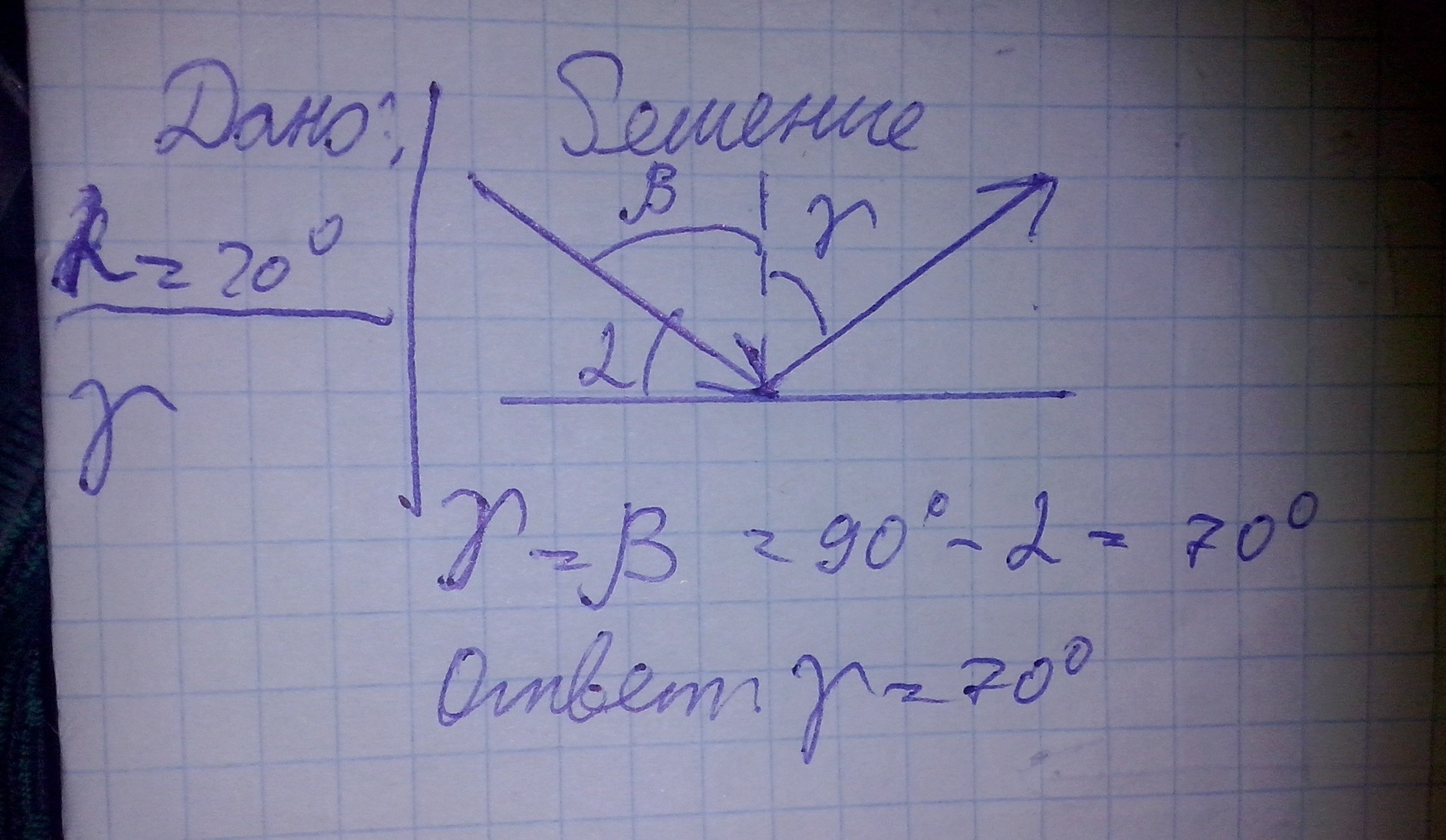 Луч света падает на зеркало под углом 20° к горизонту. Определите угол отражения.