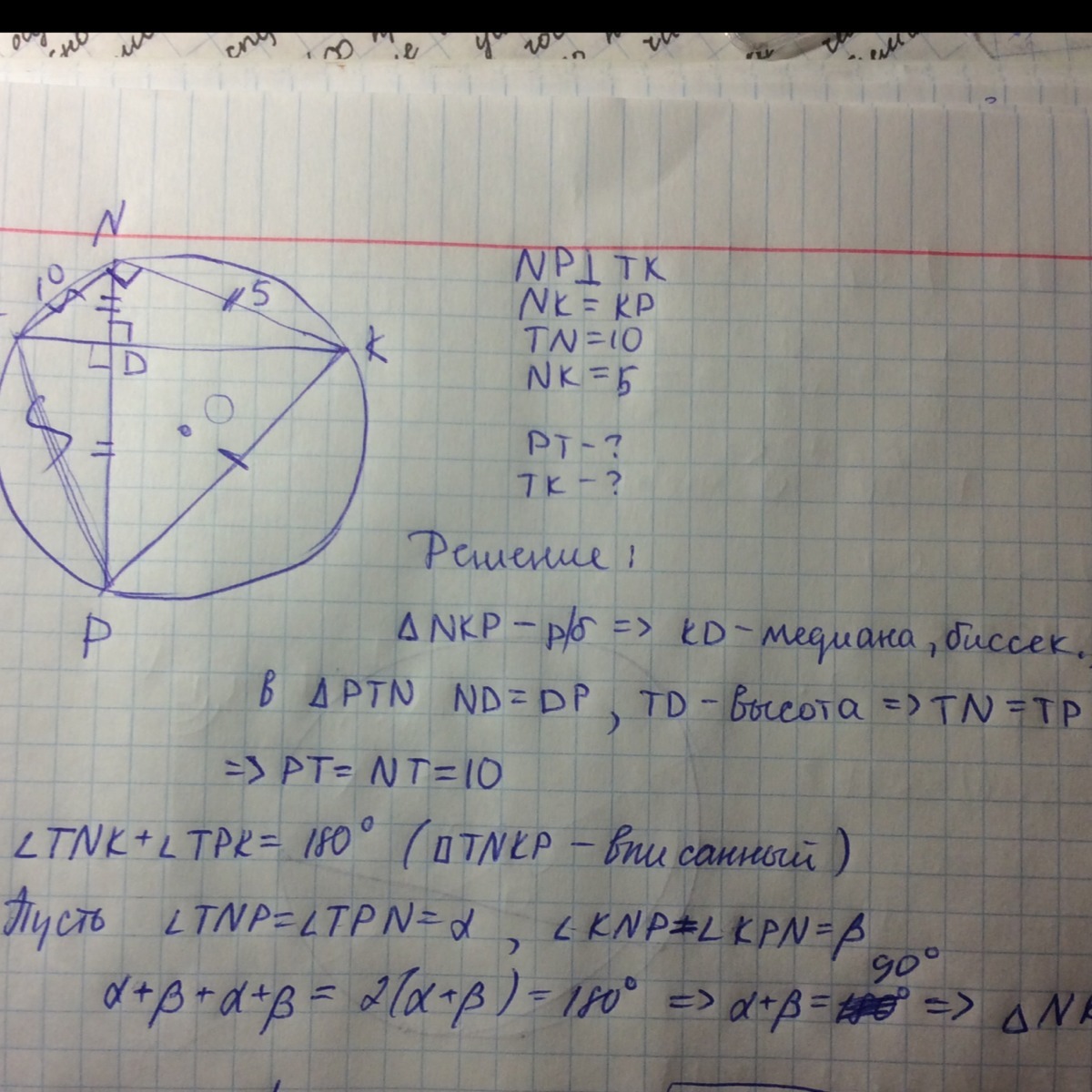 Точки T, K, N и P лежат на окружности TK⊥NP, NK = KP. Запишите, чему равны указанные величины, если TN = 10, NK = 5.