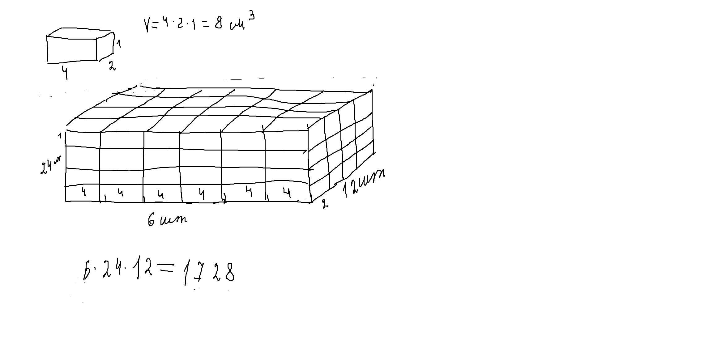 Из кирпичей, размеры которых 4 см на 2см и на 1см, сложили куб с ребром, равным 24см. Сколько кирпичей понадобится для этого