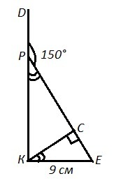 В прямоугольном треугольнике pke(k=90градвсов), где внешний угол kpd =150 градусов, ke=9см, проведена высота kc. Определите длину отрезка ce