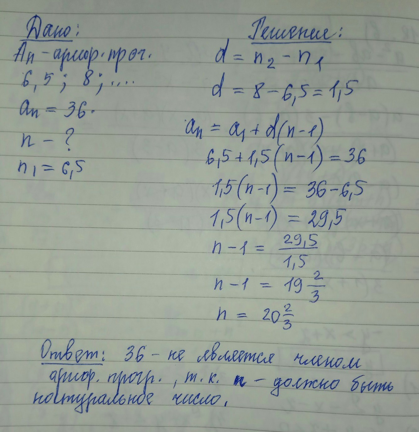 Пожалуйста помогите как можно быстреее.(An) = 6,5;8;... арифметическая прогрессия 36 является ли членом арифметическоф прогрессии