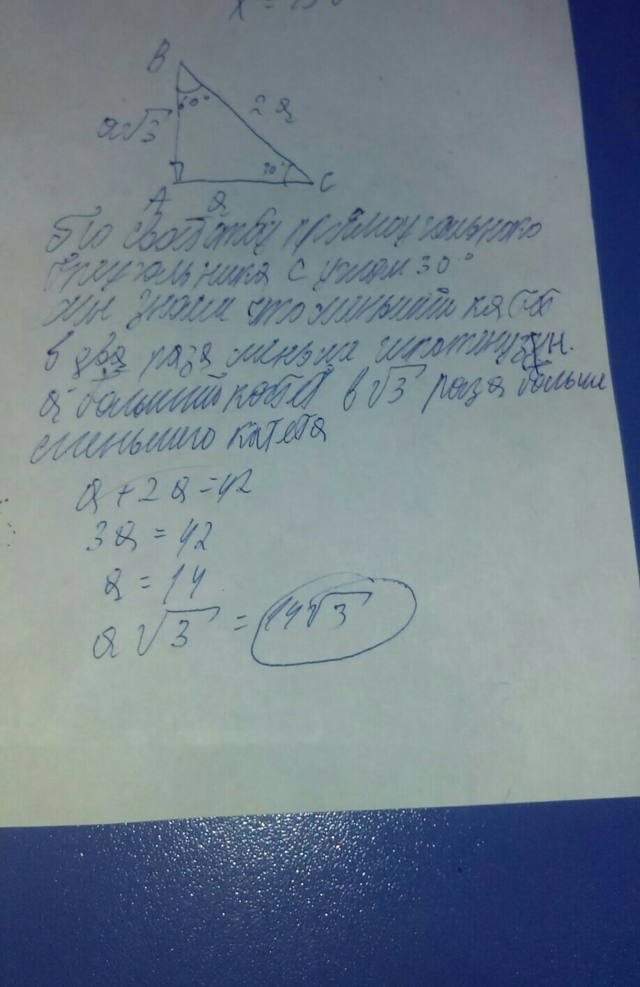 Один из углов треугольника равен 60° ,гипотенуза плюс меньший катет = 42 см . Найти сторону АВ
