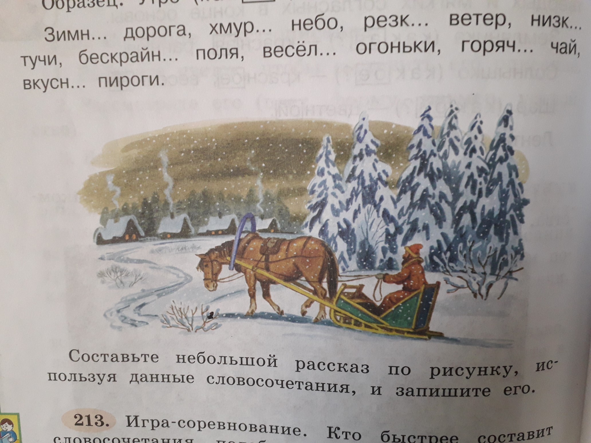 По зимней дороге едет мужик.Вокруг бескрайние поля,хмурое небо,низкие тучи.Вдруг подул холодный резкий ветер.В дали виднелись весёлые огоньки.И подумал мужик о горячем чае и вкусных пирогах.