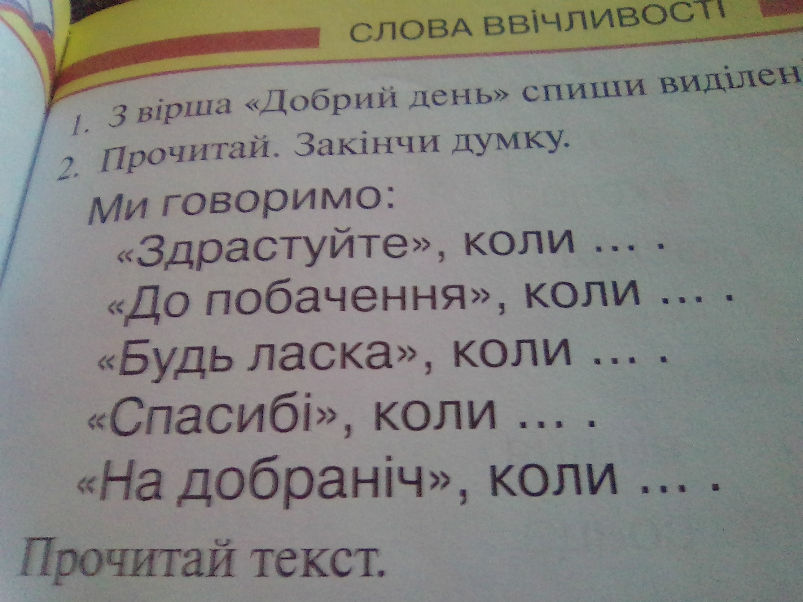 Здраствуйте ми говоримо коли зустрічаємося з кимось, до побачення коли прощаємося з людиною, будь ласка коли просимо про щось, спасибі коли дякуємо за щось, на добраніч коли лягаєш спати
