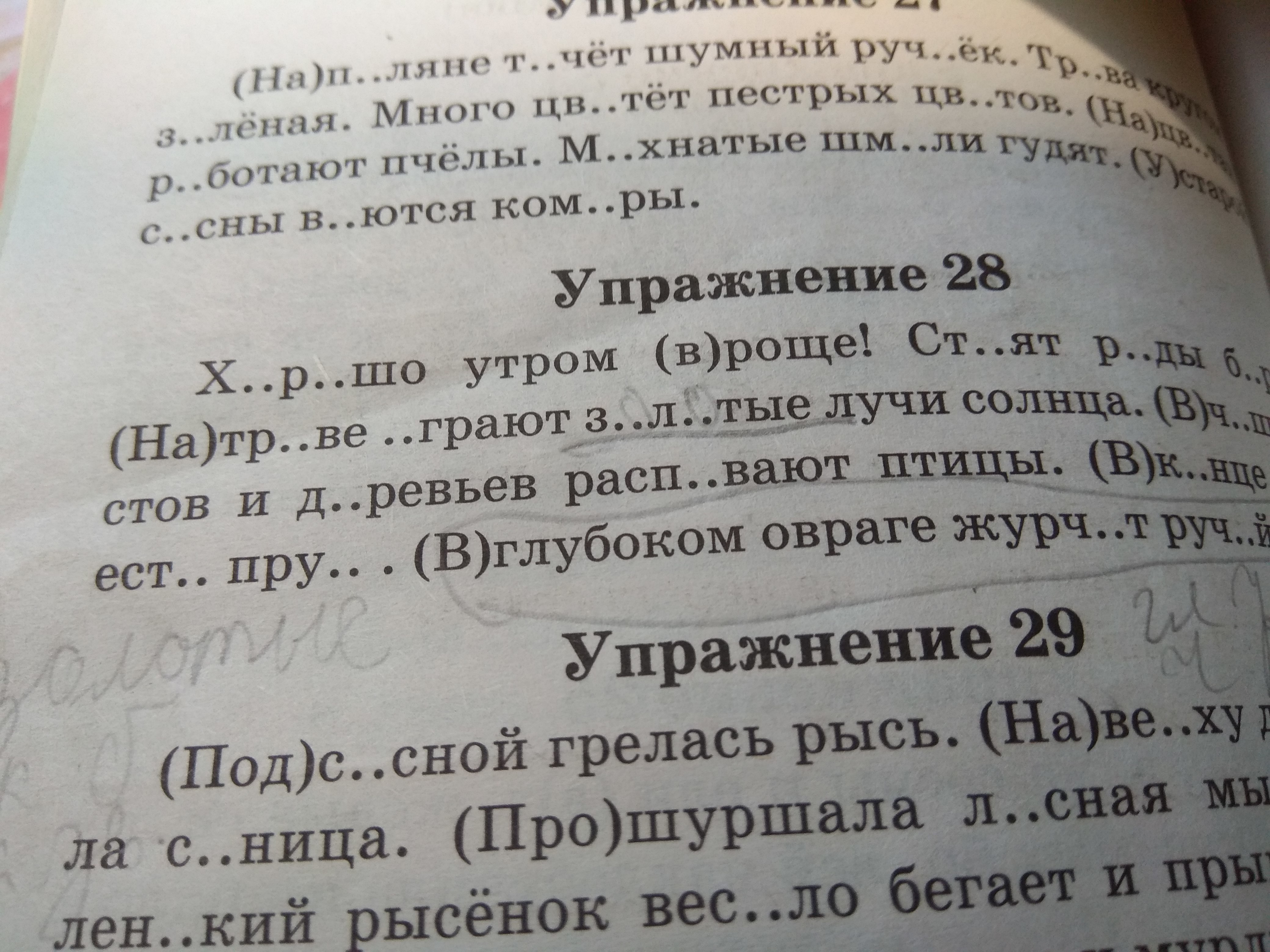 Хорошо утром в роще! Стоят ряды берёз. На траве играют золотые лучи солнца. В чаще кустов и деревьев распевают птицы. В конце ... есть пруд. В глубоком овраге журчит ручей.