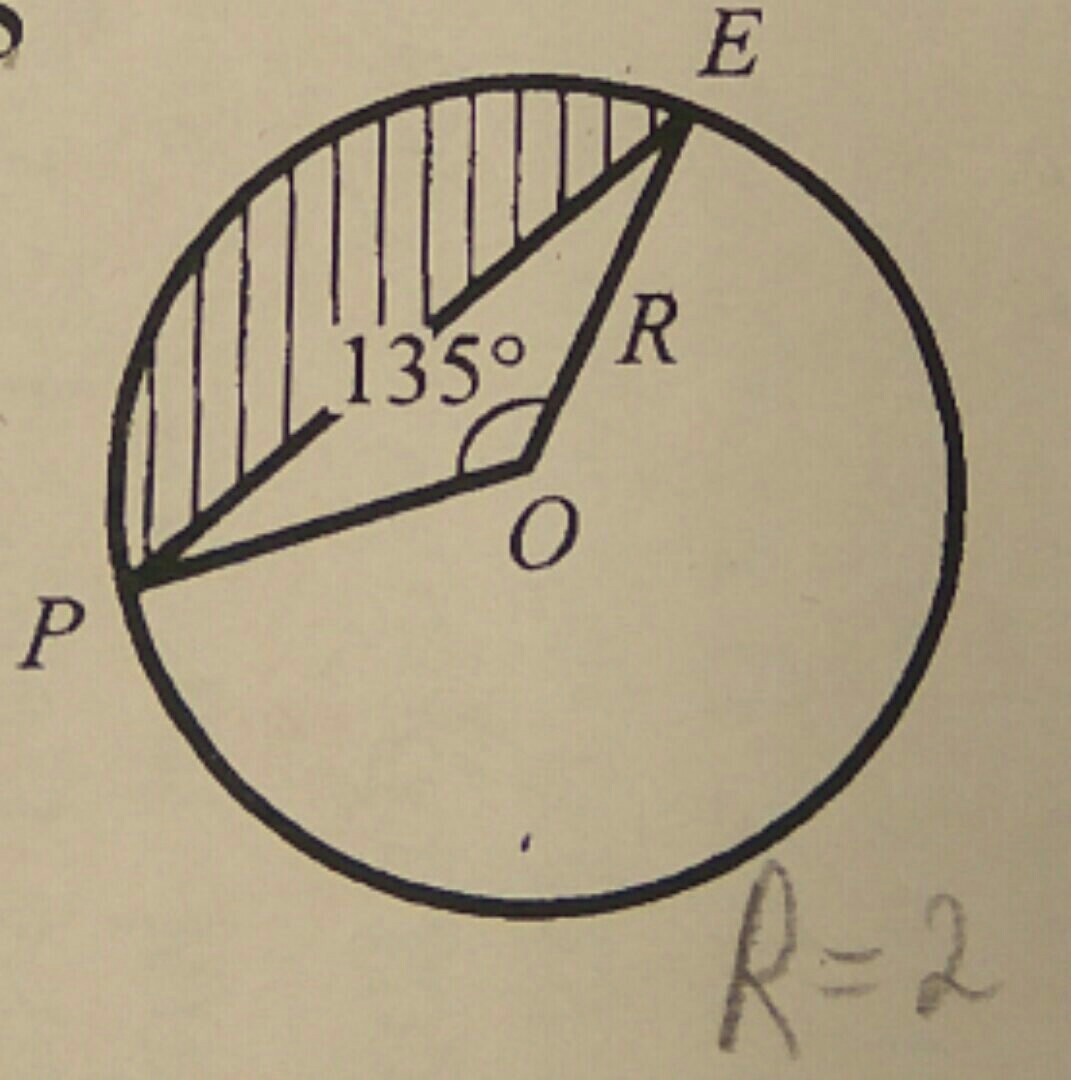 Вычислим площадь сектора, ограниченного дугой PE: S1 = πR^2* 135°/360° = π*4*135°/360° = 1,5π.