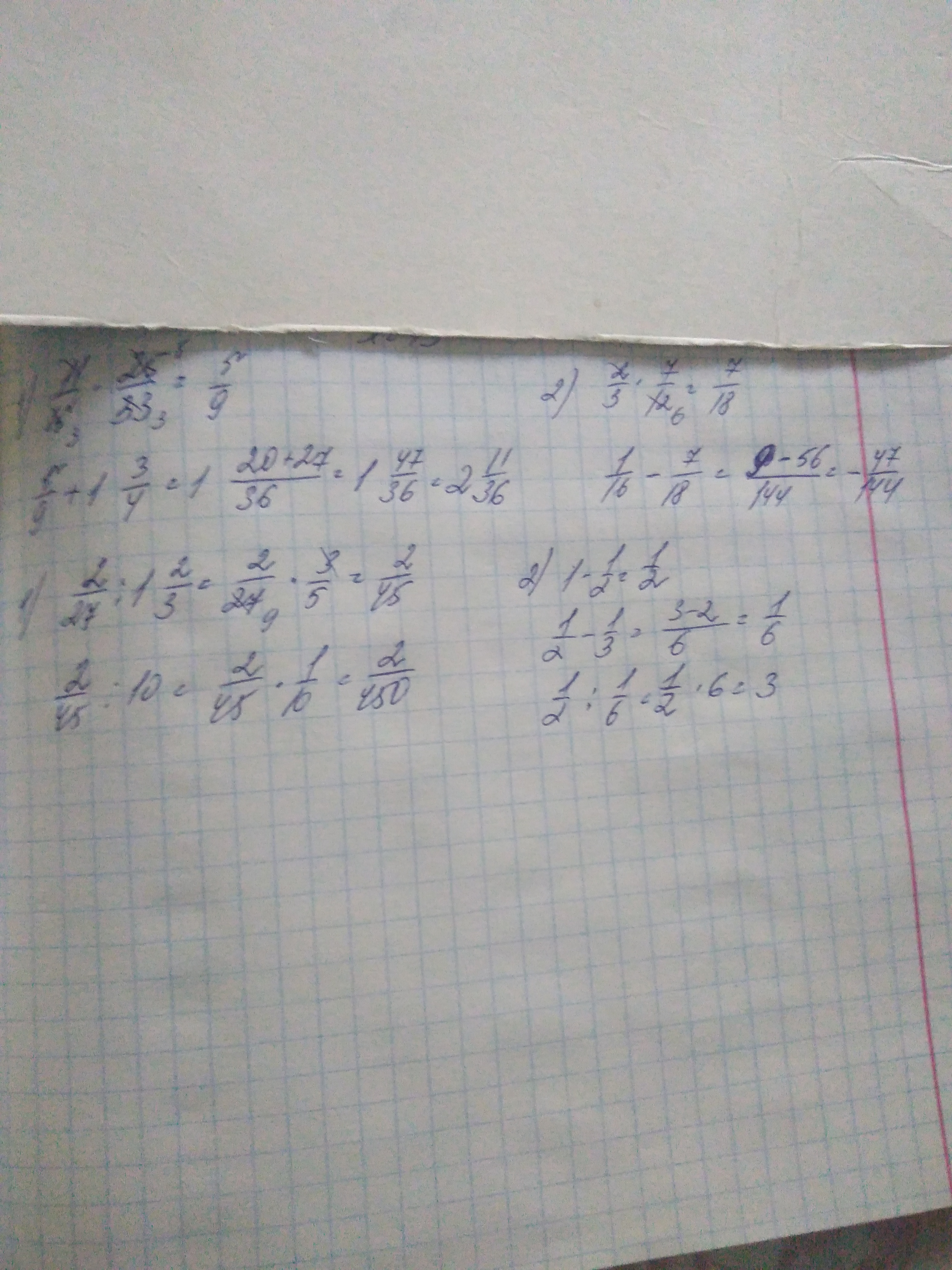 Помогите пожалуйста!!!Даю 20 баллов!!! и лучший ответ!!! Найдите значений выражений:1) 11/15 * 25/33 + 1 целая 3/4 2) 2 целых 1/16 - 2/3 * 7/12 найдите значений выражений:1) 2/27 : 1целую 2/3 :10 2) ( 1 - 1/2 ) : ( 1/2- 1/3 ) Напишите пожалуйста решение прошу, умоляю.