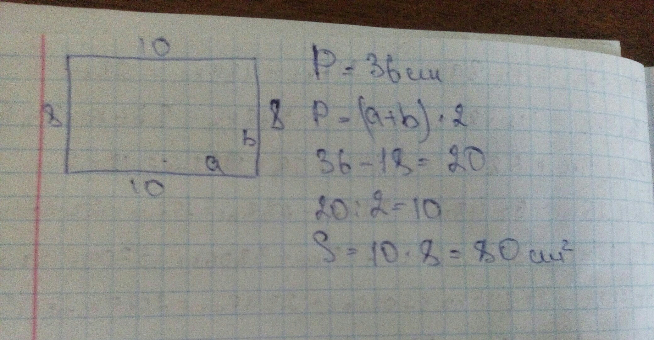 Периметр прямоугольника 36 см, длина одной из его сторон 8 см. Найди площадь прямоугольника.
