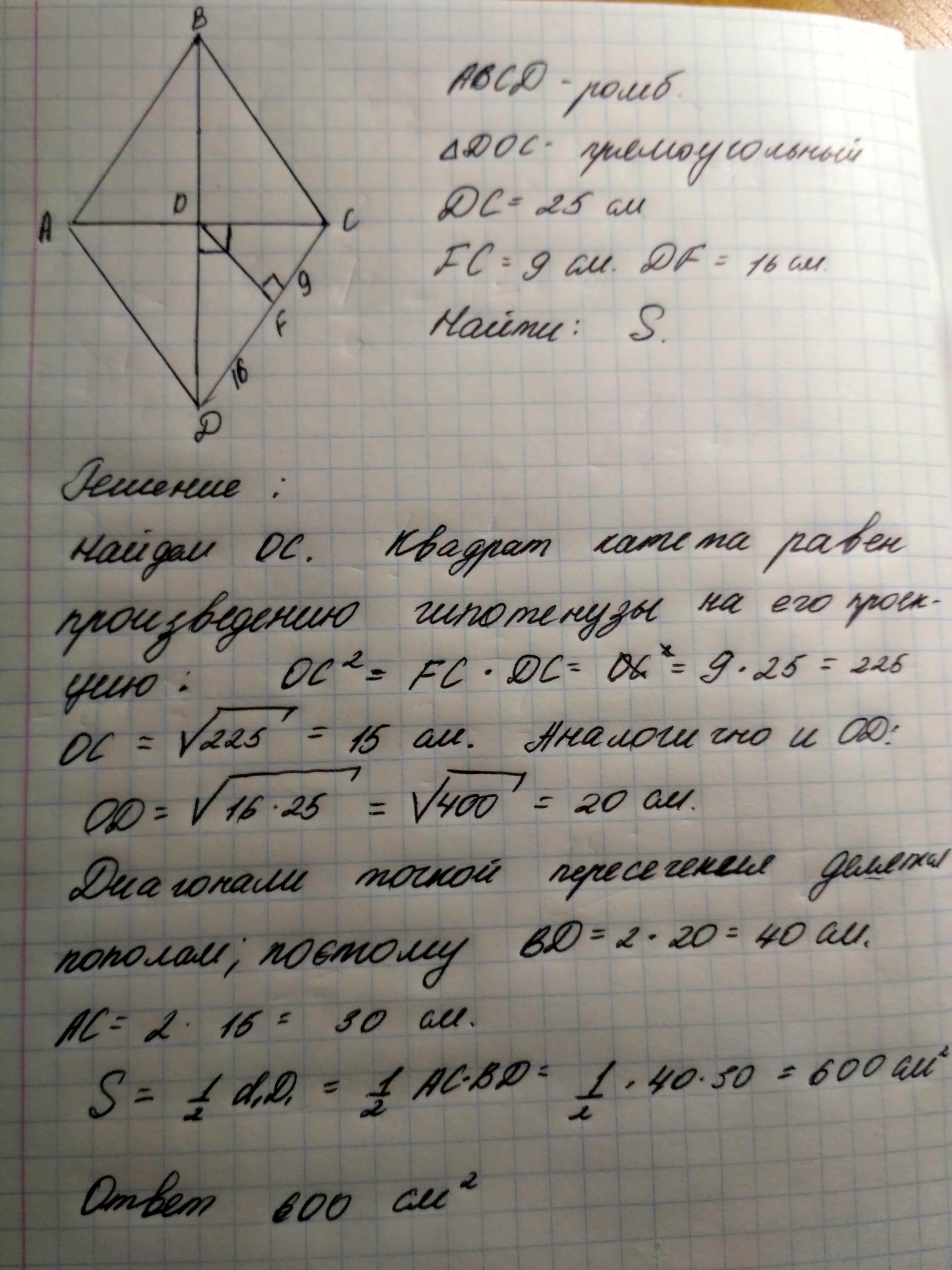 Перпендикуляр опущенный из точки пересечения диагоналей ромба на его сторону делит её на отрезки 9 и 16 см. Вычислите площадь ромба