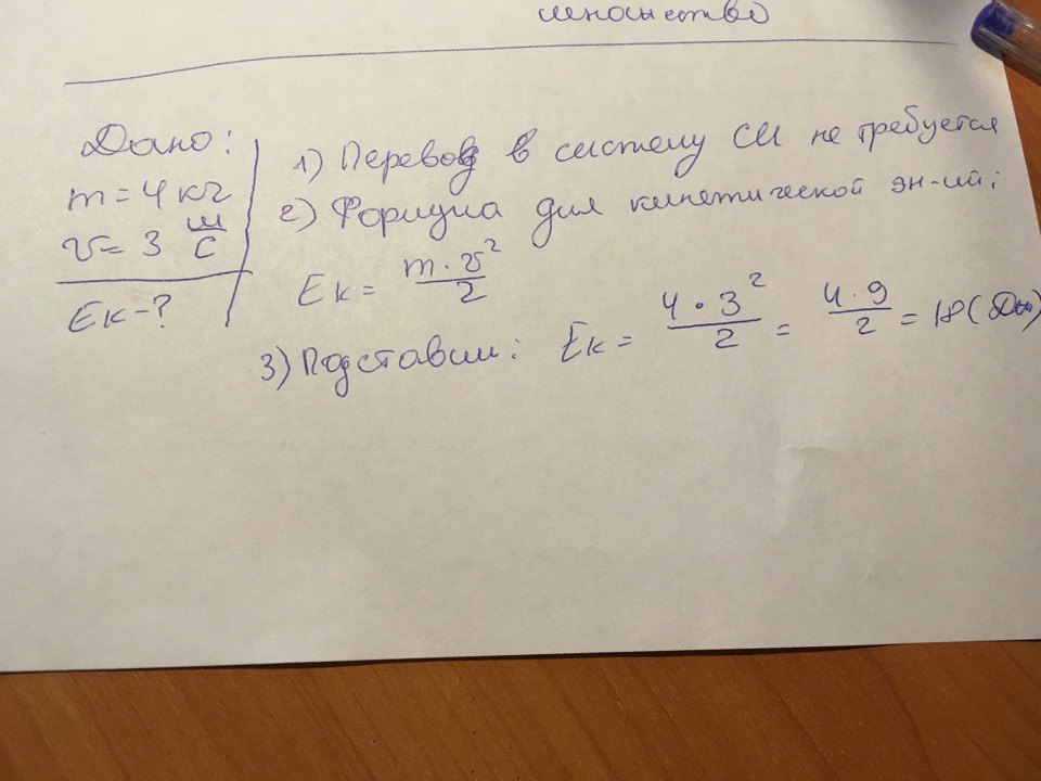 рассчитайте кинетическую энергию тела массой 4 кг движущегося со скоростью 3 м /с . полностью оформление