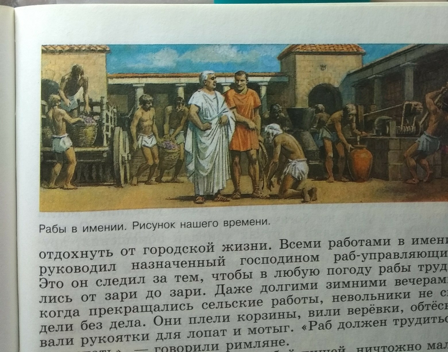 на нем много людей(рабов) друдятсь не покладая рук главного(или для хозяина)с ним рядом помошник и главный (или хозяин) спарашивает у однаго из трудившихся(у самого пожелого)что то спрашивает или говорит, тот верно перед ним скланился.