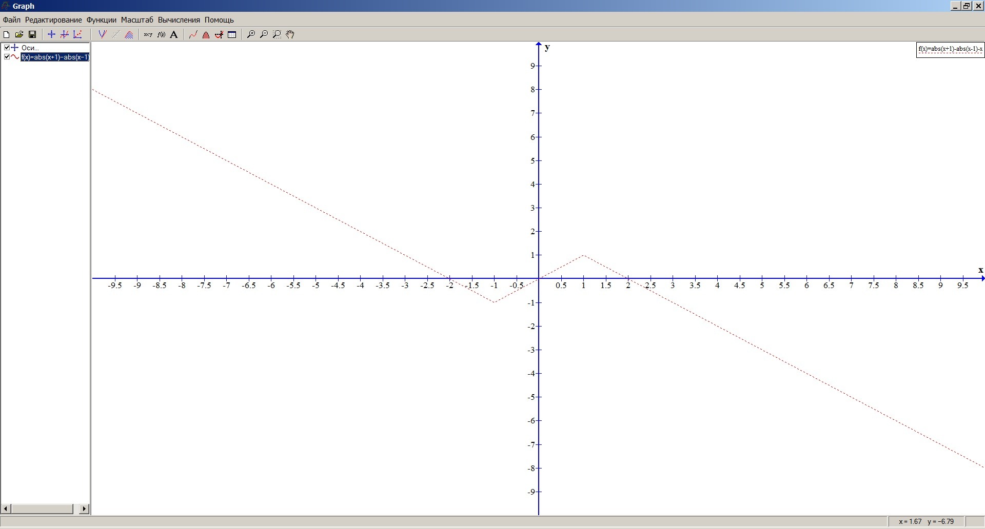 У тебя есть 3 промежутка, на которых нужно раскрыть модули и построить график отдельно на каждом из этих промежутков, а потом объединить решения:
