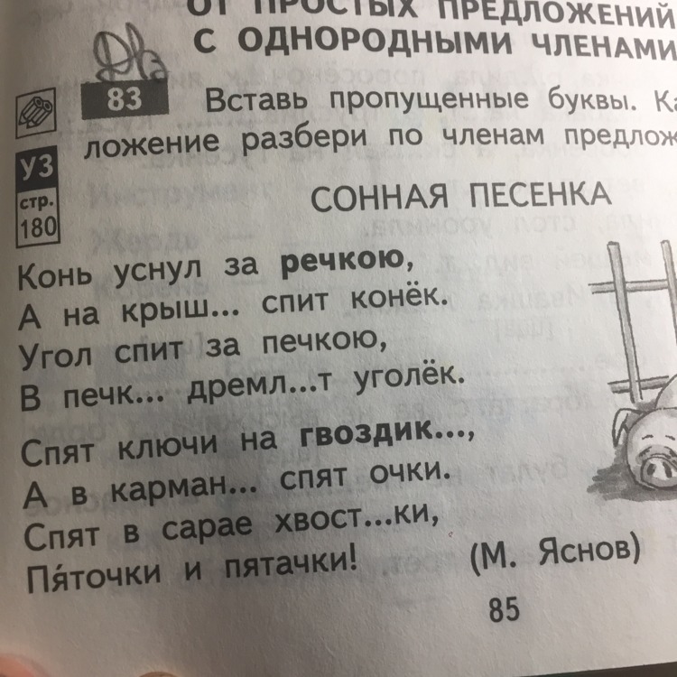 На крыше, в печке дремлет, на гвоздике, кармане, хвостики. Конь уснул, спит конёк угол спит, дремлет уголек, спят ключи, спят очки, спят хвостики пяточки и пяточки