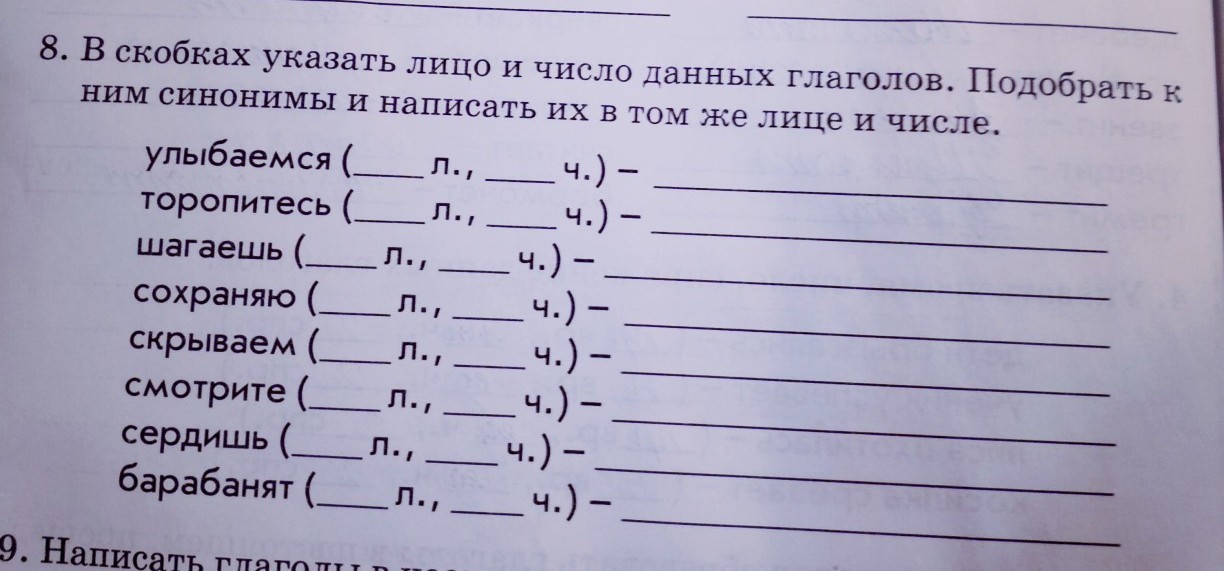 улыбаемся- смеёмся= множ.число,1 лицо. торопитесь-спешите= множ.ч., 2 лицо. шагаешь-идёшь- ед.ч., 2 лицо.сохраняю-берегу= ед.ч., 1 лицо. скрываем-прячем=множ.ч., 1лицо. смотрите- глядите= множ.ч., 2 лицо. сердишь- раздражаешь= ед.ч.,2 лицо. барабанят-стучат= множ.ч.,3 лицо.