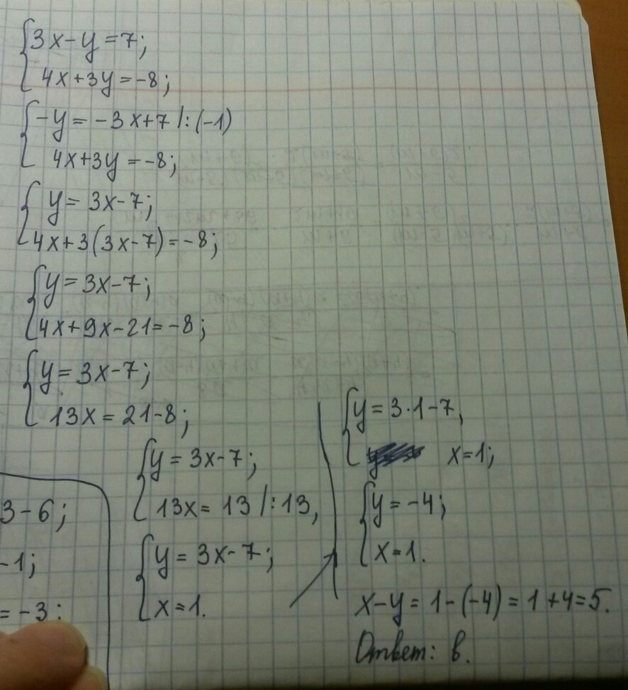 решите систему уравнений 3x - y= 7 4x + 3y= -8