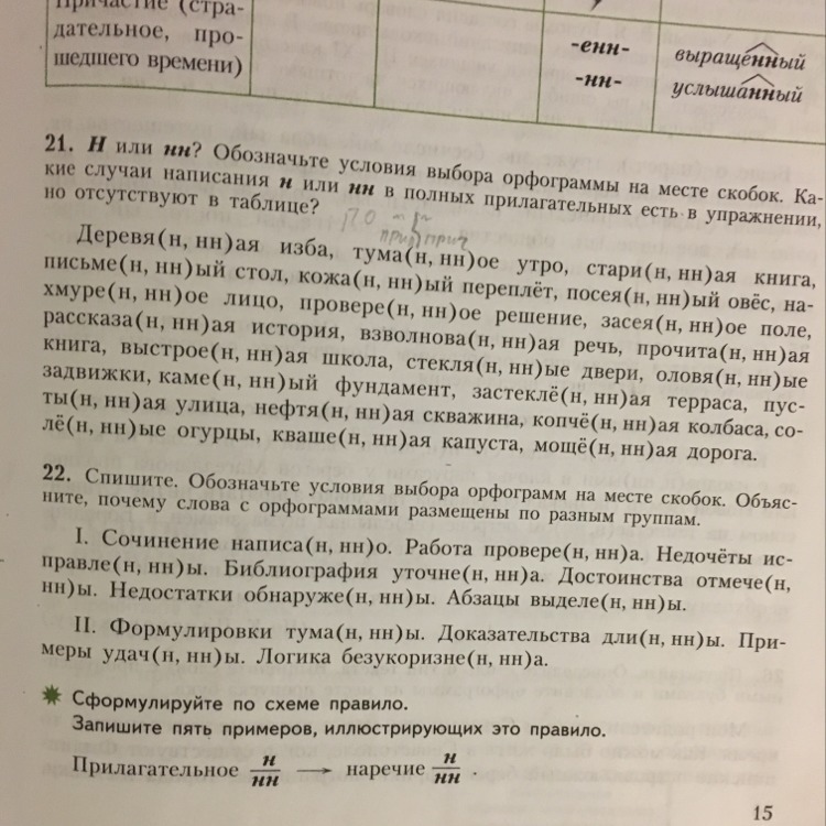 Деревя(нн)ая изба, тума(нн)ое утро, стари(нн)ая книга, письме(нн)ый стол, кожа(н)ый переплёт, посея(нн)ый овёс, нахмуре(нн)ое лицо, провере(нн)ое решение, засея(нн)ое поле, рассказа(нн)ая история, взволнова(нн)ая речь, прочита(нн)ая книга, выстрое(нн)ая школа, стекля(нн)ые двери, застеклё( нн)ая терраса, каме(нн)ый фундамент, оловя(нн)ые задвижки, пусты(нн)ая улица, нефтя(н)ая скважина, копчё(н)ая колбаса, солё(н)ые огурцы, кваше(н)ая капуста, мощё(н)ая дорога
