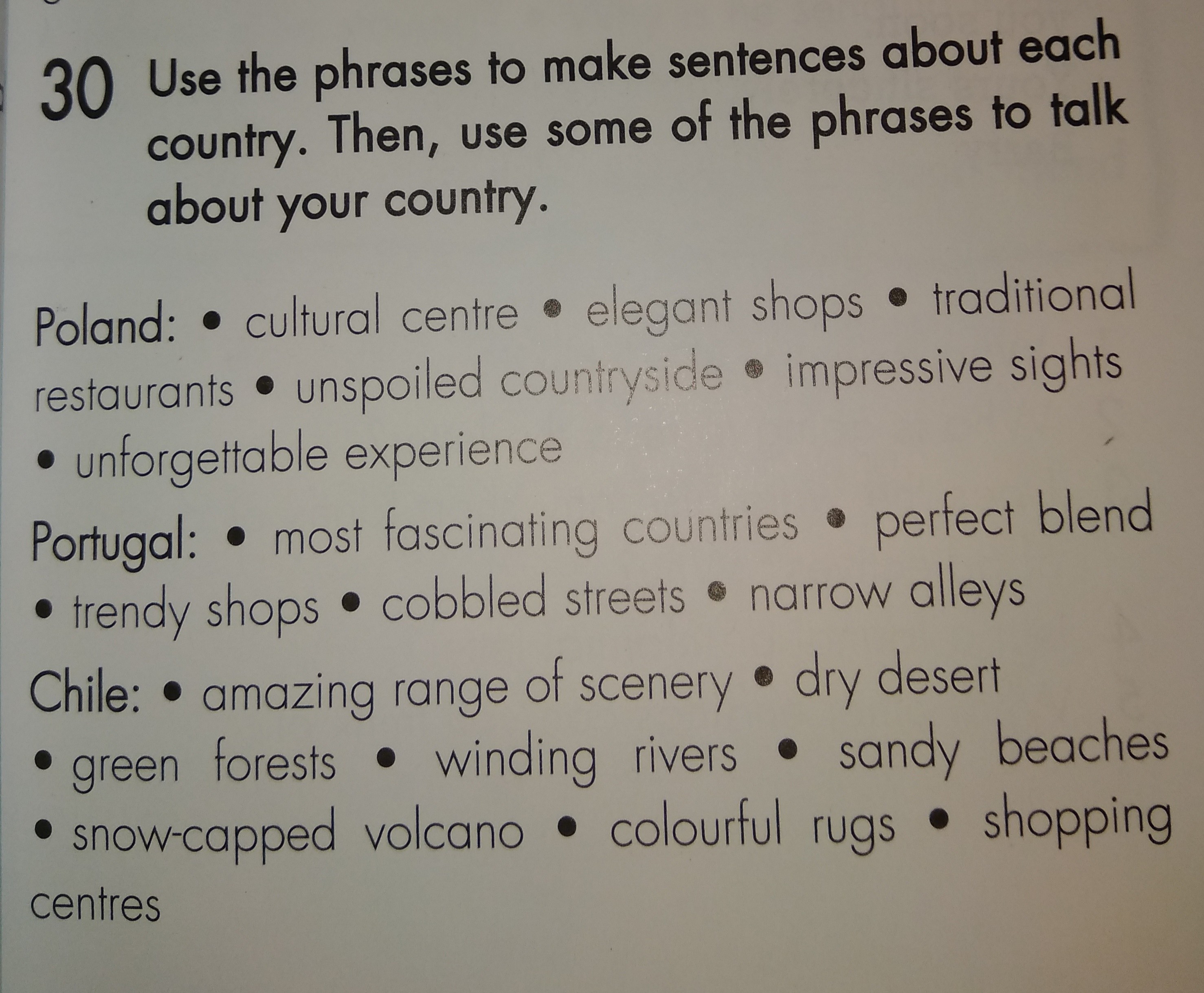 Use the phrases to make sentences about each country. Then, use some of the phrases to talk about your country